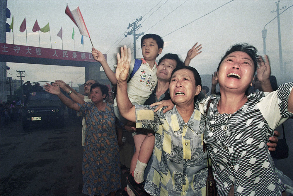 1998年8月4日九江县(现柴桑区)江洲长江大堤决口后,群众向武警呼喊救人。