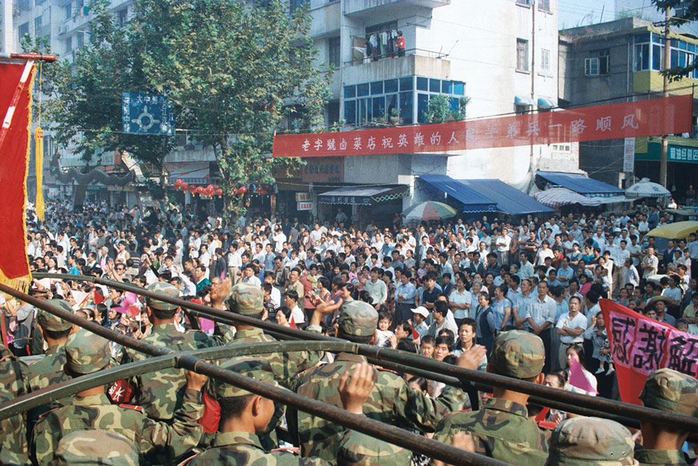 军车在水泄不通的欢送人群中缓缓慢行。