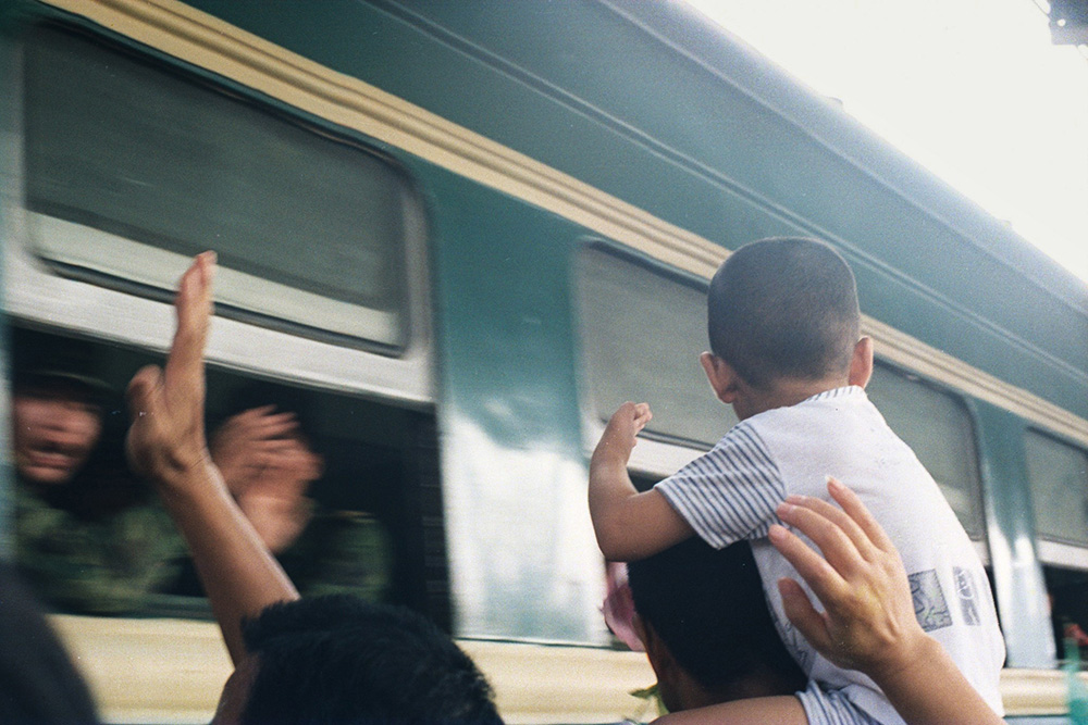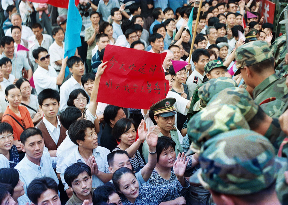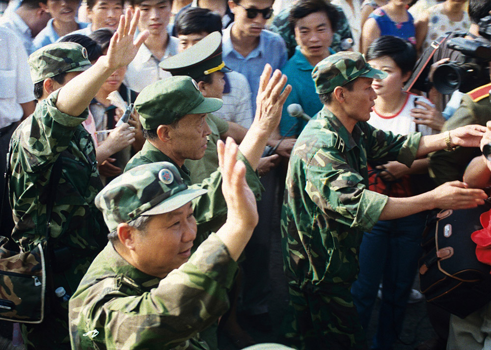 南京军区领导在随部队离开九江时,九江人民在车站欢送。