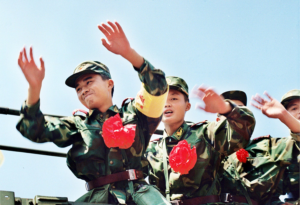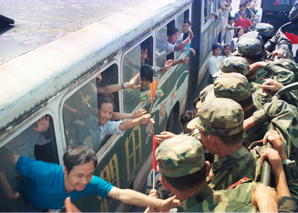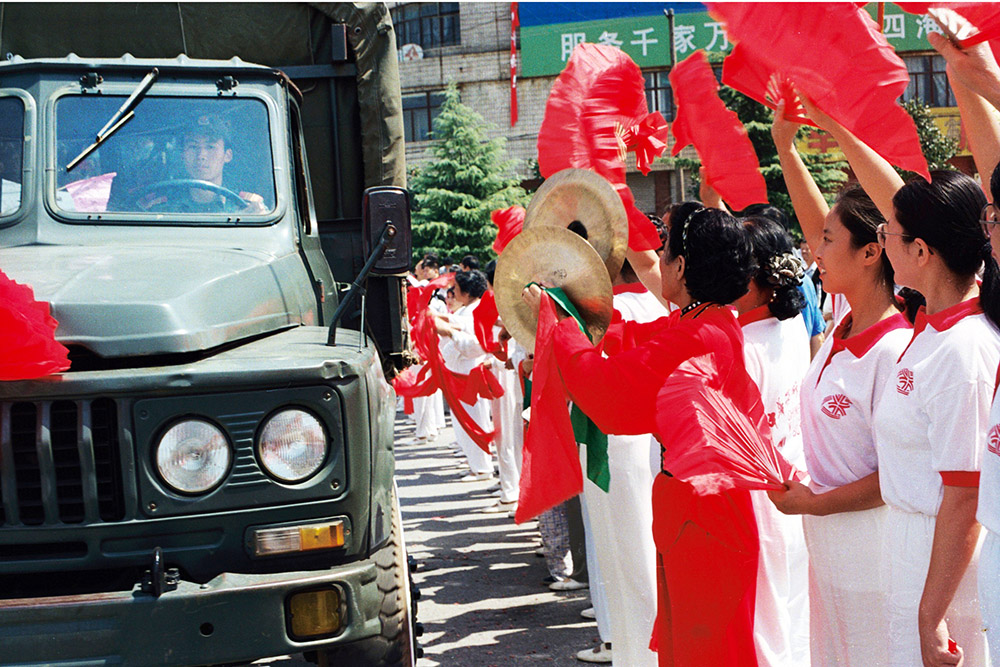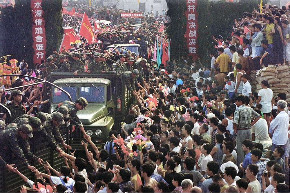 欢送抗洪子弟兵凯旋。