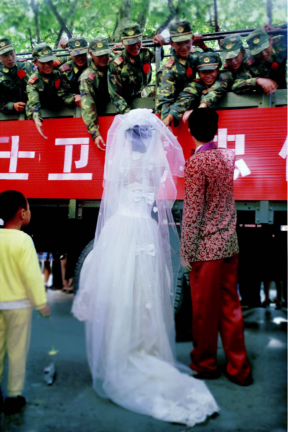 这对新人的婚礼巧遇欢送解放军和武警官兵,他们和官兵相互道别和祝福。