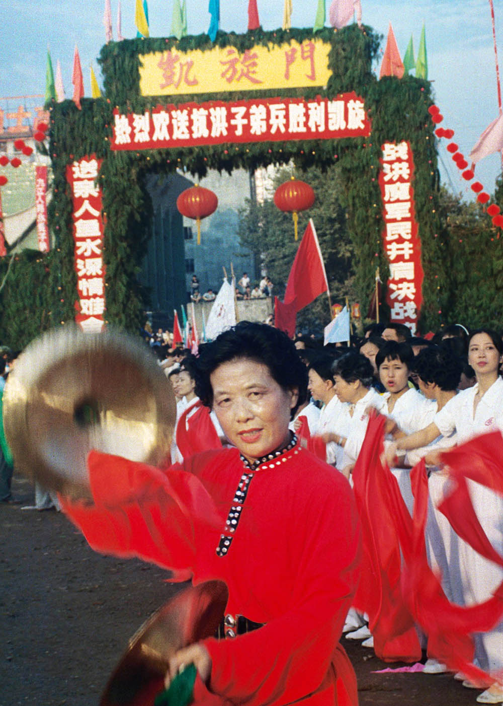 凯旋门前鼓乐齐鸣、载歌载舞。