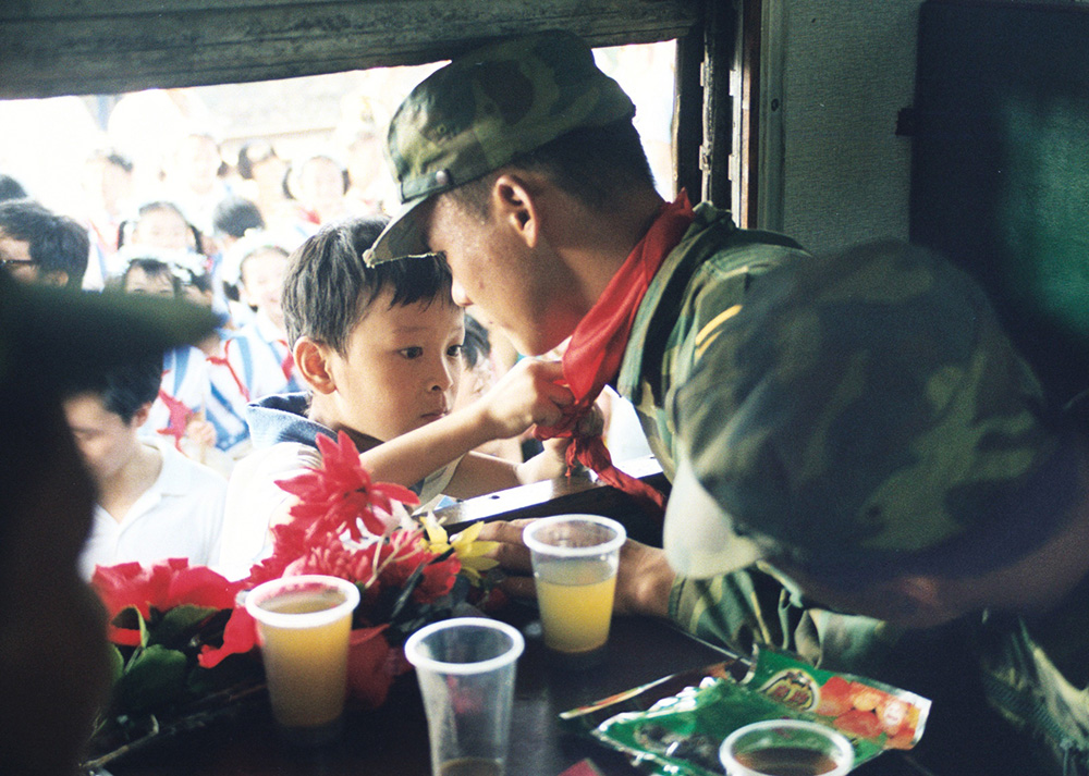 少先队员向抗洪英雄献上红领巾。