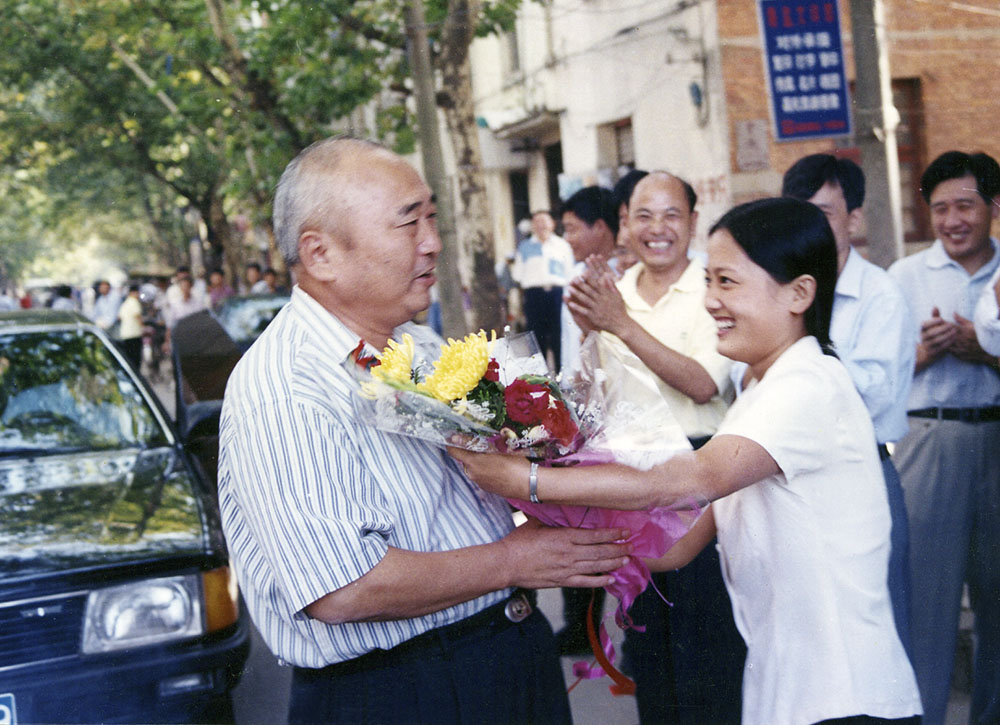 驻闽某集团军副政委王健代表部队在教师节期间向人民教师送上慰问品。