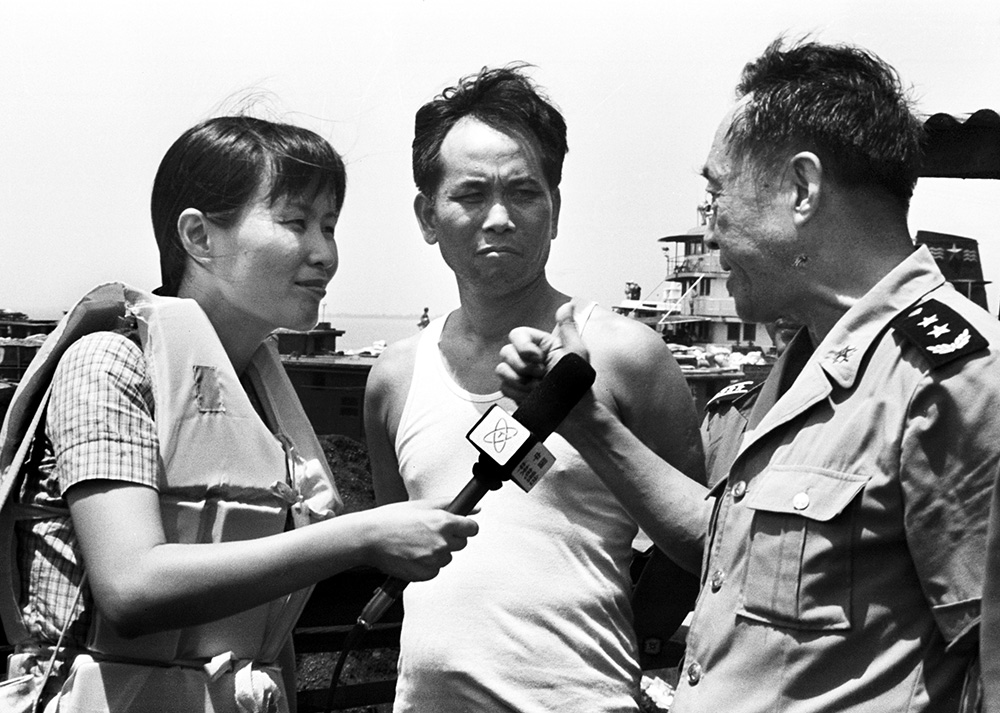 1998年8月9日,中央电视台记者在九江堵口现场采访。