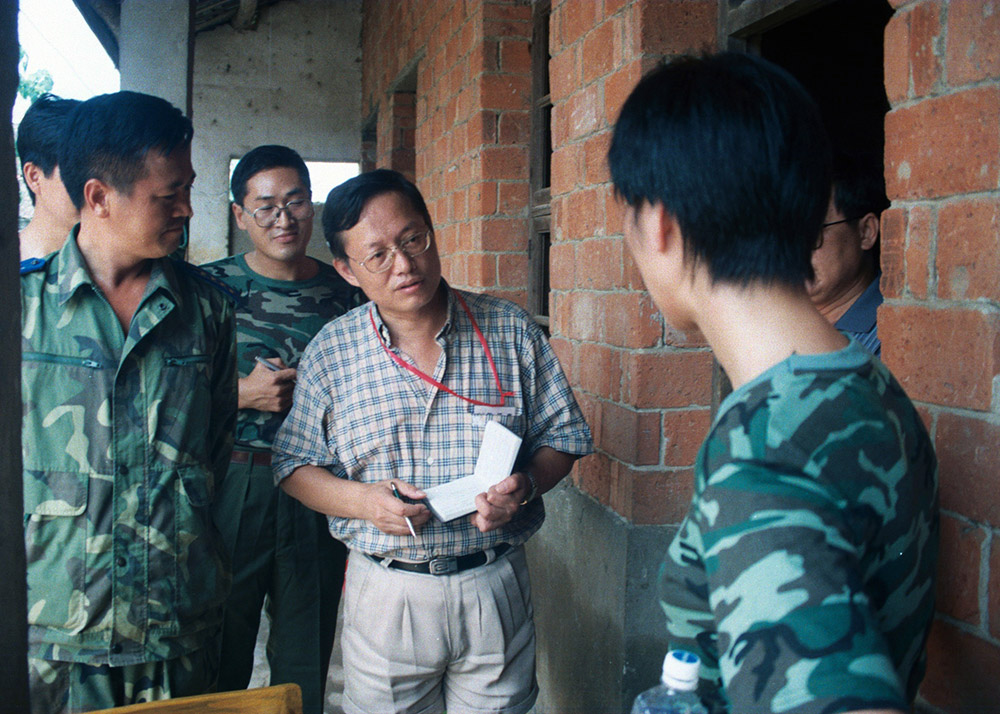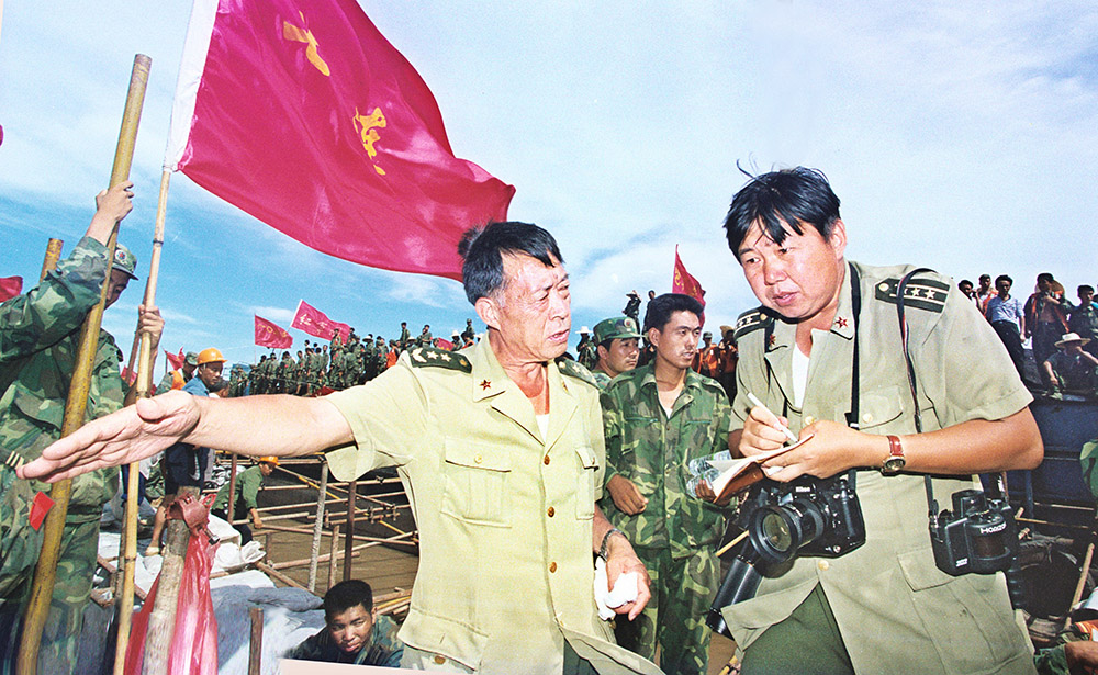 《文汇报》记者浦建平在永修县采访驻沪部队赴永修抗洪官兵。