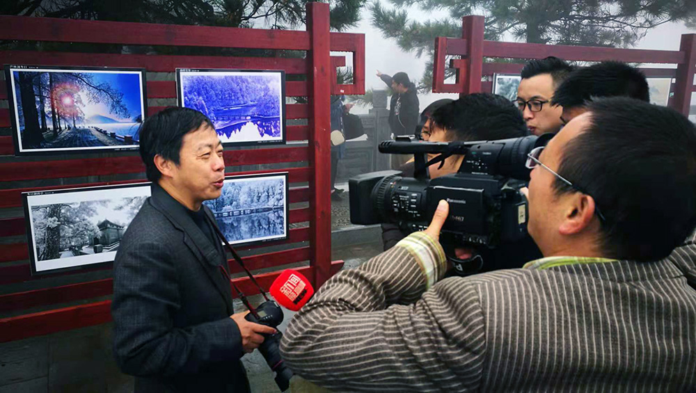 江西省摄影家协会副主席、九江市摄影家协会主席宋小勇在展览现场接受媒体采访