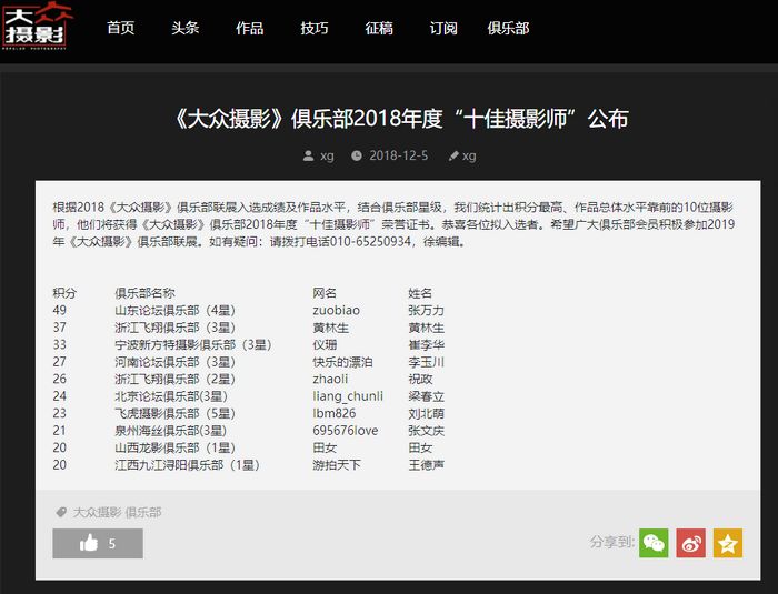 王德声荣获《大众摄影》俱乐部2018年度“十佳摄影师”