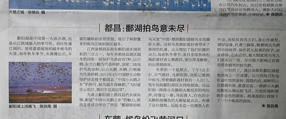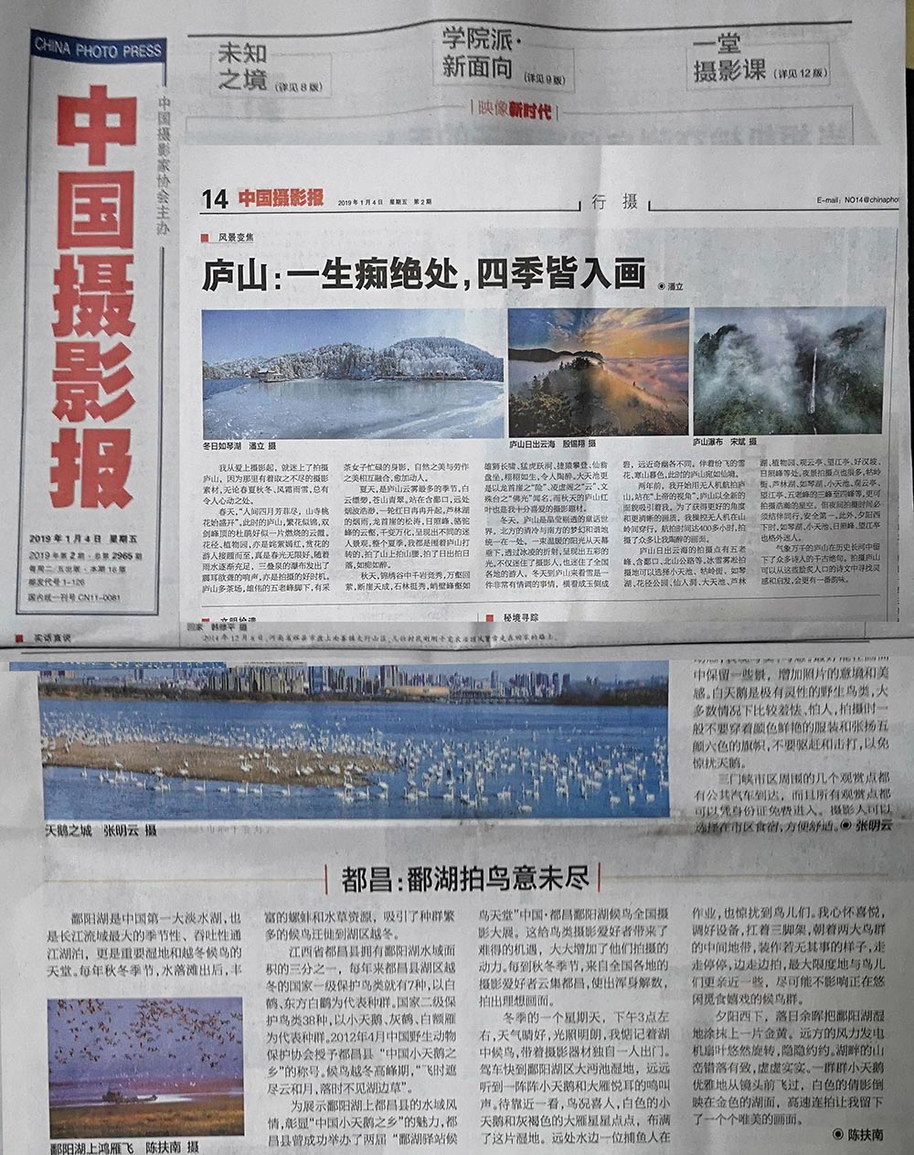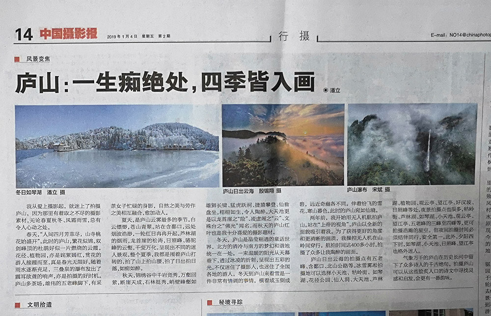 1月4日的《中国摄影报》14版头条位置发表了潘立的《庐山:一生痴绝处,四季皆入画》的文章,并配发了潘立、殷锡翔、宋斌三幅庐山风光作品;同日的《中国摄影报》11版发表了都昌陈扶南的《都昌:鄱阳湖拍鸟未尽》的文章,并配发了一幅作品。