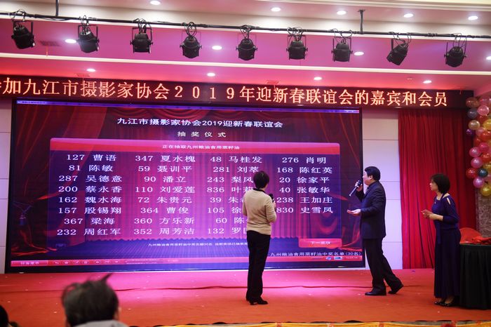 期间,播放了九江市摄协2019年贺岁专题片,表演了基层团体会员单位选送的精彩文艺节目。今年的抽奖奖品多,奖励物资和服务近10万元,中奖率高达50%以上。赞助单位九江神州国旅董事长吴峻,浙江名爵工贸有限公司九江直营店总经理陈世猛,九江台美医疗美容总经理周淑琴,江西陶令酒业公司大客户负责人伊莎,庐山华微国际度假酒店总经理赵勇,九江九州粮油实业有限公司副总经理史雪凤,奇洋口腔宣传部部长赵乐,美的铂悦府置业顾问刘佼佼,庐绣丝庄吴大丽,南铁国旅九江分公司总经理刘建华,浙江双盈生物科技有限公司金福家全国总经销商杨梦雪,江西卫民蜜蜂园有限公司代表李均忠,九江宏达汽车集团总经理助理叶利萍分别作了企业宣传介绍,穿插进行了抽奖活动。