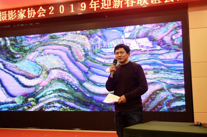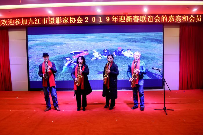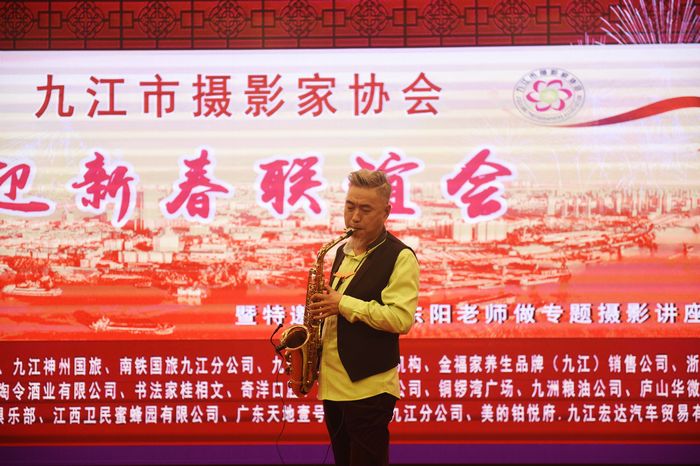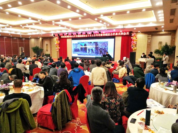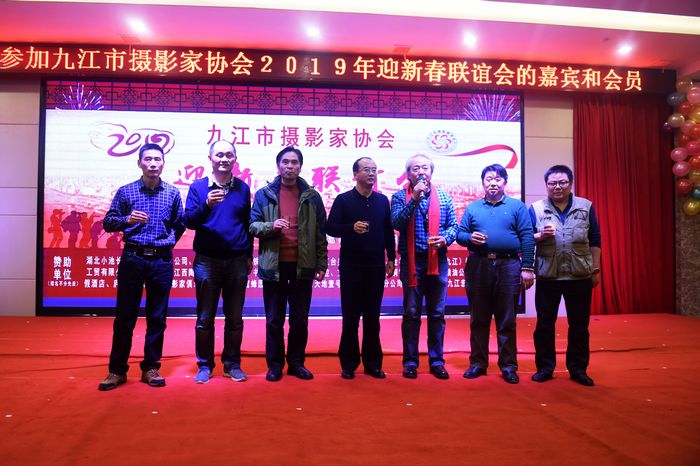 在晚宴上的九江市摄协班子成员集体向摄友贺新春