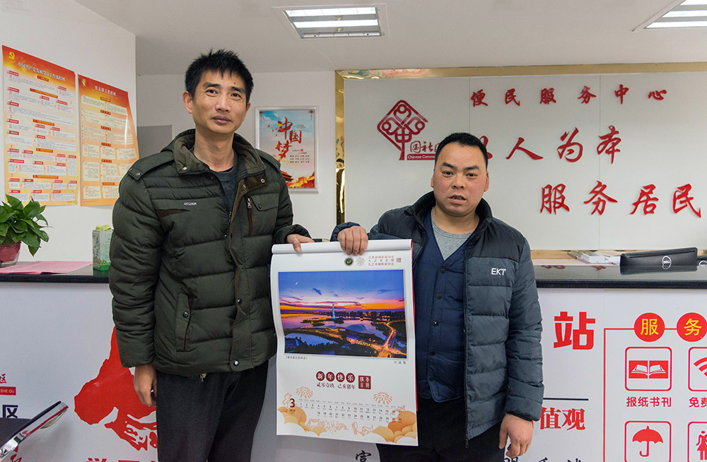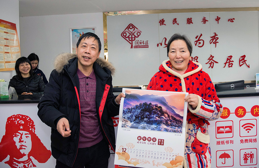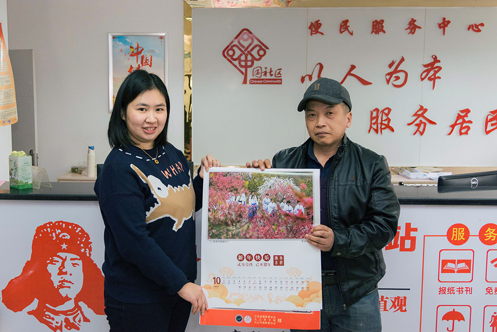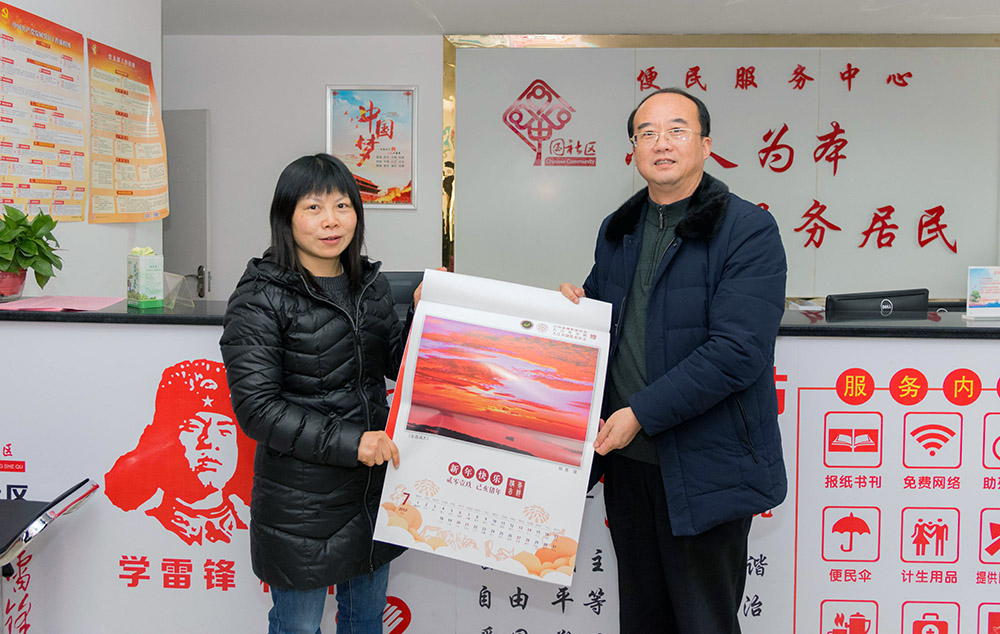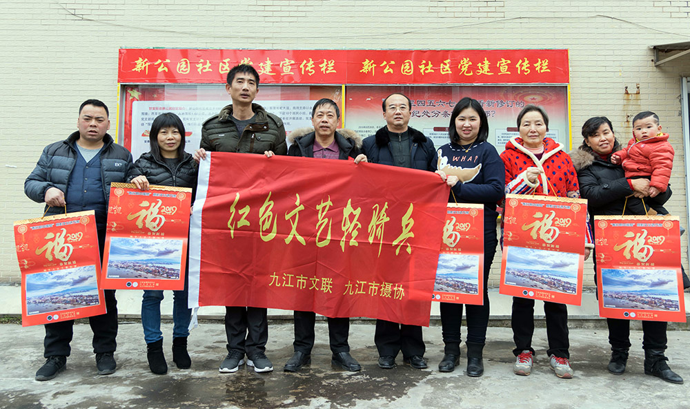 九江摄影网讯(木力)2019年2月1日下午,由江西省摄影家协会副主席、九江市文联副主席、九江市摄影家协会主席宋小勇,九江市摄影家协会副主席杨青等组成的“红色文艺轻骑兵”走进了浔阳区新公园社区,向辛勤工作的社区干部、部分居民赠送了用摄影家们自己作品编印的贺岁挂历,并祝他们新春快乐!