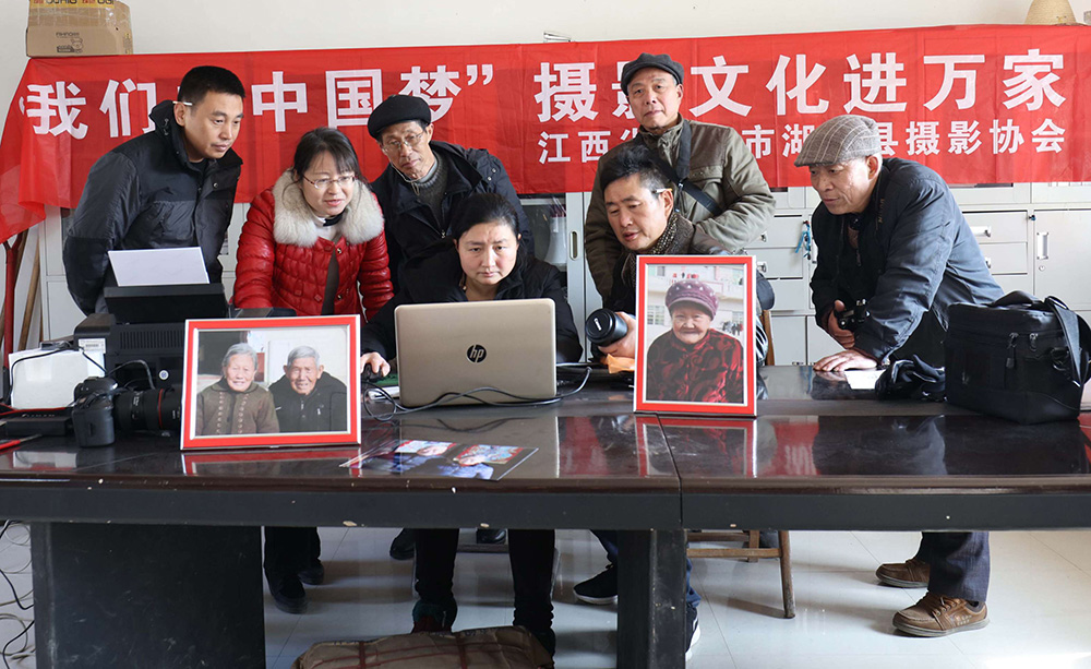 九江摄影网(陶淼金)2019年1月26日上午,湖口县摄影家协会组织10名摄影志愿者和县农商银行2名志愿者,来到付垅乡一甲村饶林山和河垅张自然村,开展了“我们的中国梦一一摄影文化进万家〞公益服务活动,摄影家们逐户为村民拍摄全家福和幸福照,农商银行志愿者为每户村名赠送了春联。
