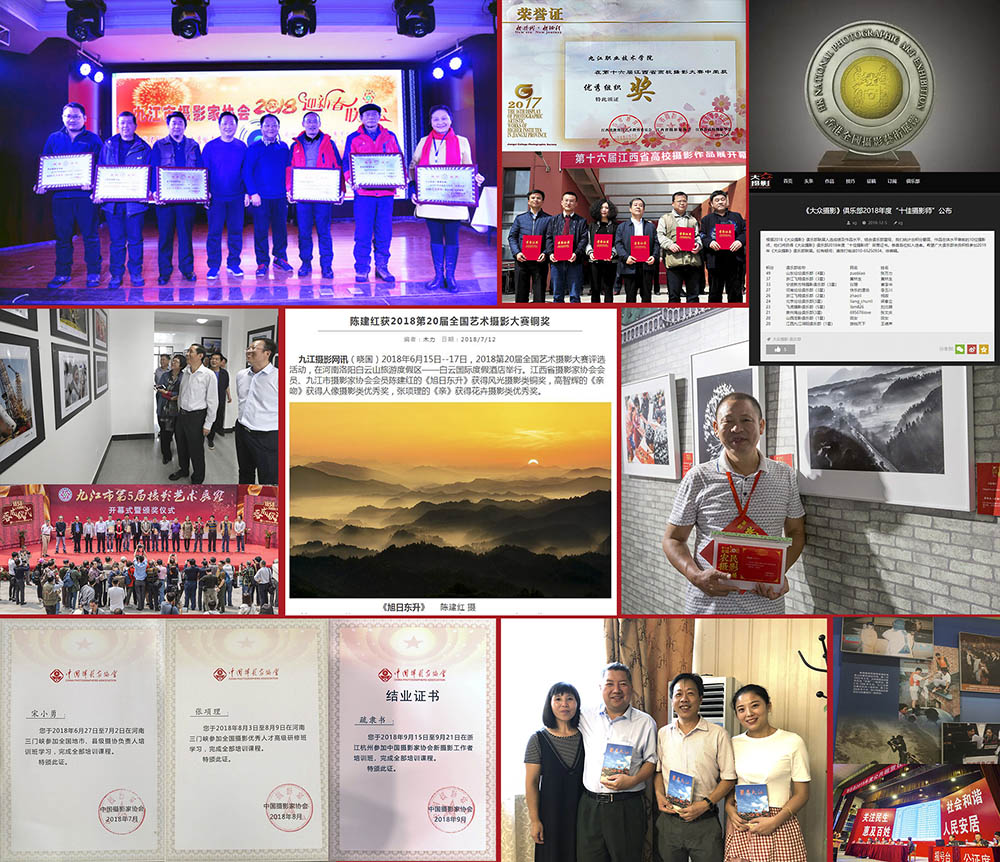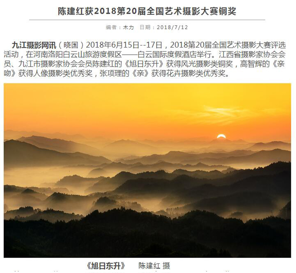 6月15日—17日,2018第20届全国艺术摄影大赛评选活动在河南洛阳白云山旅游度假区——白云国际度假酒店举行。江西省摄影家协会会员、九江市摄影家协会会员陈建红的《旭日东升》获得风光摄影类铜奖,高智辉的《亲吻》获得人像摄影类优秀奖,张项理的《亲》获得花卉摄影类优秀奖。