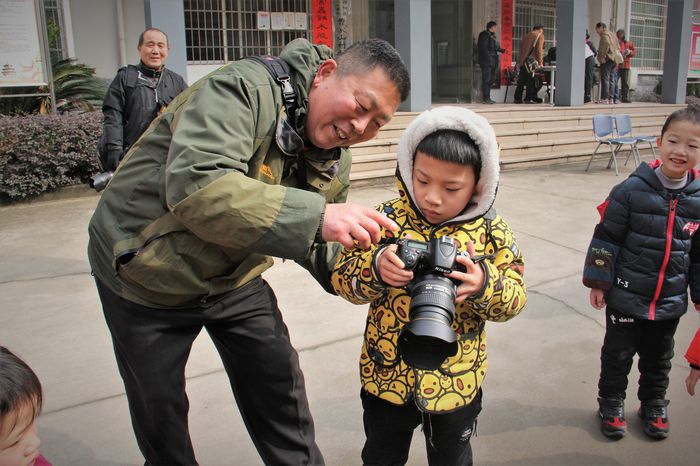 摄影志愿者还耐心教小朋友拿起相机培养对摄影的爱好