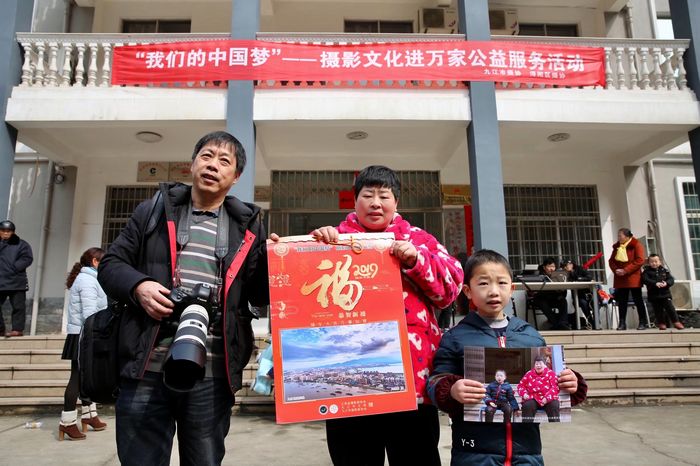 九江市职工摄影家协会主席田小元和浔阳区摄影家协会秘书长封丽君向村民们赠送挂历和照片