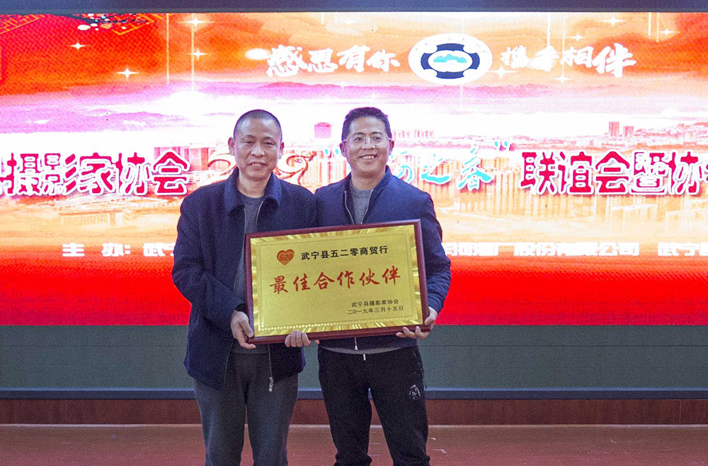 蒋德先向武宁县五二零商贸行总经理乐荣宝授予“最佳合作伙伴”奖牌。