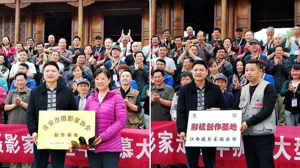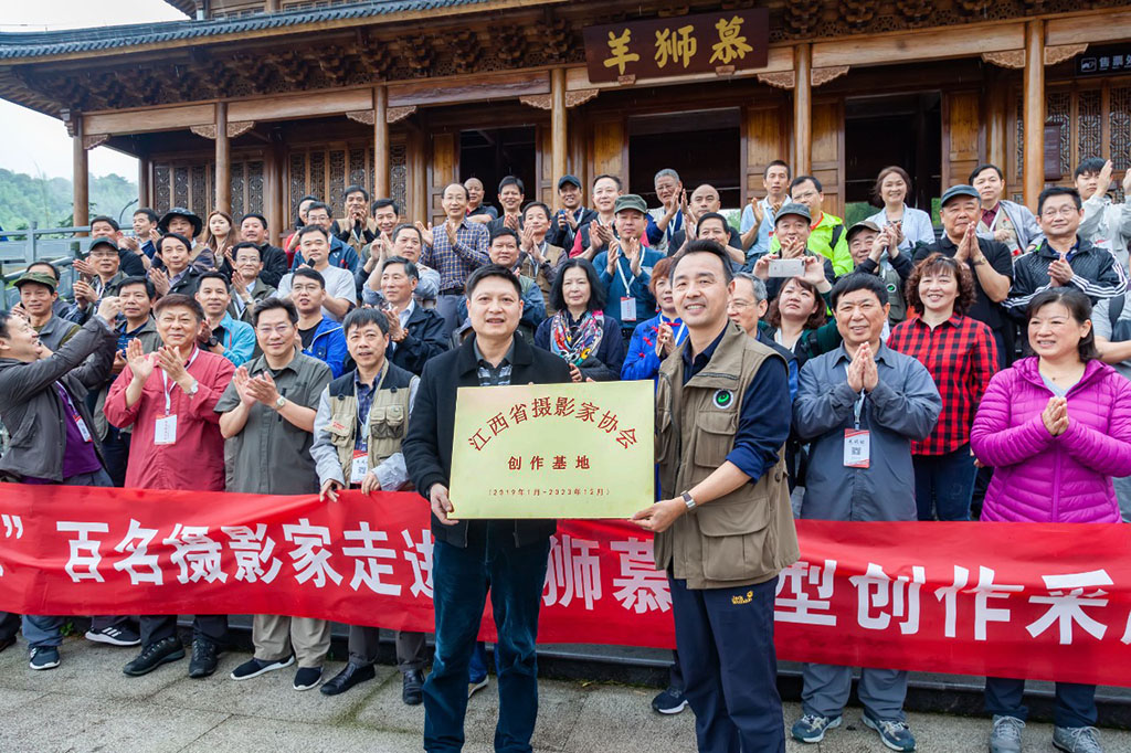 吉安市摄协主席吴燕、江西摄影家俱乐部主任付志勇为羊狮慕授创作基地牌匾