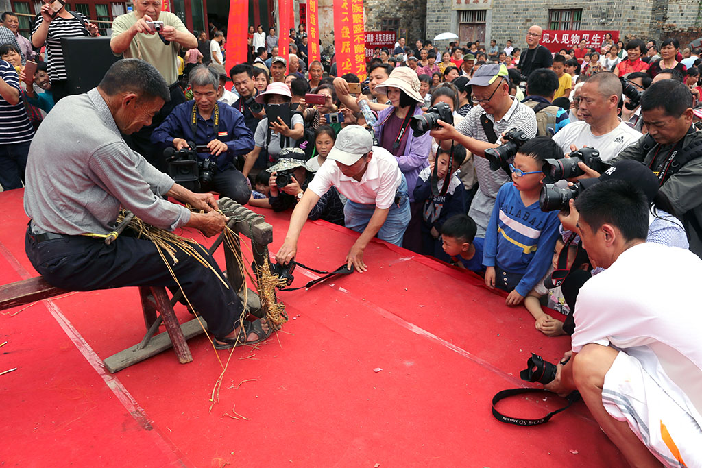 今年在太婆会上首先表彰了由县内各庄推选、最后由宗亲会评选出的11位贤妻良母,之后表演了锄山鼓、山歌、腰鼓、抬花轿、舞龙狮、十八般武艺等一系列的民俗艺术节目,84岁的九江民歌大王徐嘉琪也登台献唱,将活动推向了高潮。为了让后辈们了解农耕之事,还进行了打草鞋、砻谷、磨豆腐、纺纱织布等农技表演。