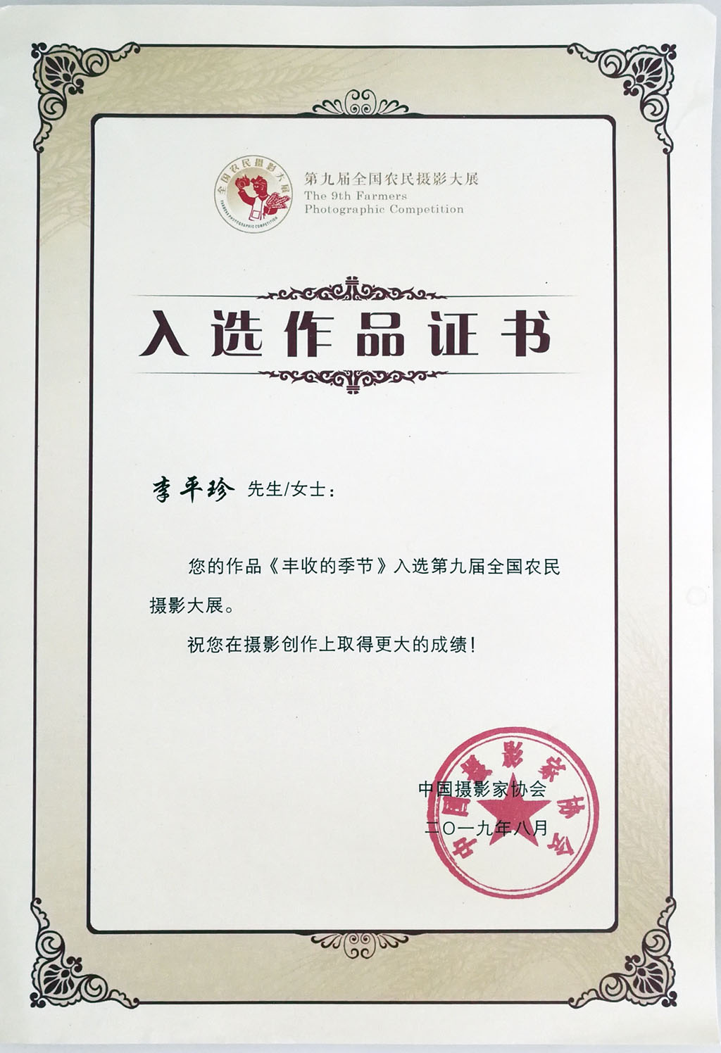 九江摄影网讯(木力)8月10日,由中国文学艺术界联合会、中国摄影家协会主办的第九届全国农民摄影大展在北京·民族文化宫展览馆开幕。本届大展选出的135件入选作品在此集中展示,再现了新时代新农民的精神风貌,以及新农村建设的丰硕成果和喜人变化等。展览旨在用这些根植于泥土且充满温度的摄影作品,成为新时代中国农业农村现代化进程的影像见证,成为激励广大人民不断奋进的精神力量。其中九江庐山市摄影家协会副主席李平珍的作品《丰收的季节》获得入选。这也是九江摄影家连续多届都有作品入选全国农民摄影大展。