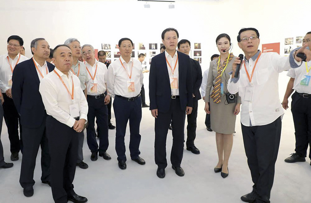 李前光在李舸、郑更生、惠新安等陪同下观看展览
