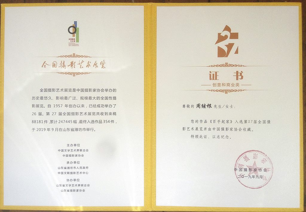 九江摄影网讯(宋小勇 张志龙)9月27日至10月6日,由中国文学艺术界联合会、中国摄影家协会主办,山东省潍坊市人民政府、中国文联摄影艺术中心承办的第27届全国摄影艺术展览暨首届潍坊国际摄影周在山东潍坊十笏园文化街区开幕。354件作品从88181件(247445幅)中脱颖而出,亮相展览。中国摄影家协会会员、九江市濂溪区摄影家协会副主席周继根的作品《百手起家》入选“创意和商业类”展览。这也是九江连续四届都有作品入选国展。