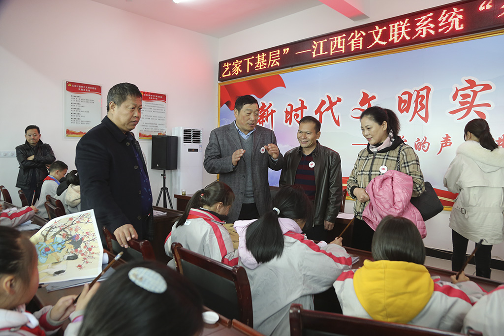 龙红、毛国典在庐山市白鹿镇玉京村指导学生书法 11月28日,万名文艺家下基层——江西省文联系统“名家讲堂”“文艺轻骑兵”进入新时代文明实践中心(所、站)活动来到庐山市白鹿镇玉京村,省文联副主席、省剧协主席龙红,省文联副主席、省书协主席毛国典,省书协副主席张英俊,省摄协副主席汪小毅,九江市文联副主席段虹,省摄协副主席、九江市文联副主席、九江市摄协主席宋小勇,省美协副主席、九江市美协主席宋跃林,省美协综合材料绘画艺委会委员、国家一级美术师孔德峰,省美协理事黎墨等知名艺术家为村民送文艺。