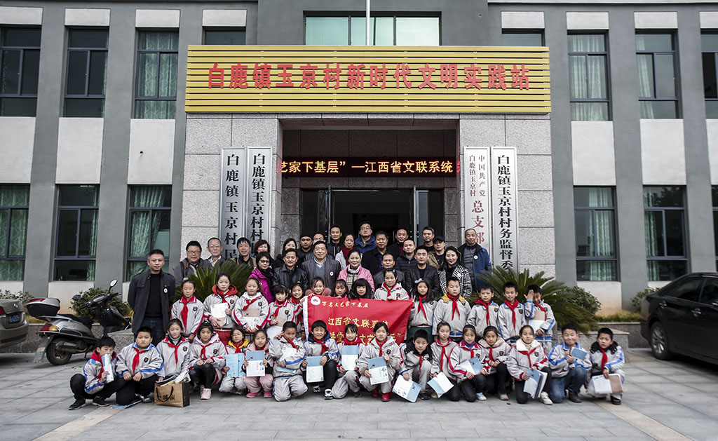 到庐山市白鹿镇玉京村开展活动的艺术家与当地学生合影 |