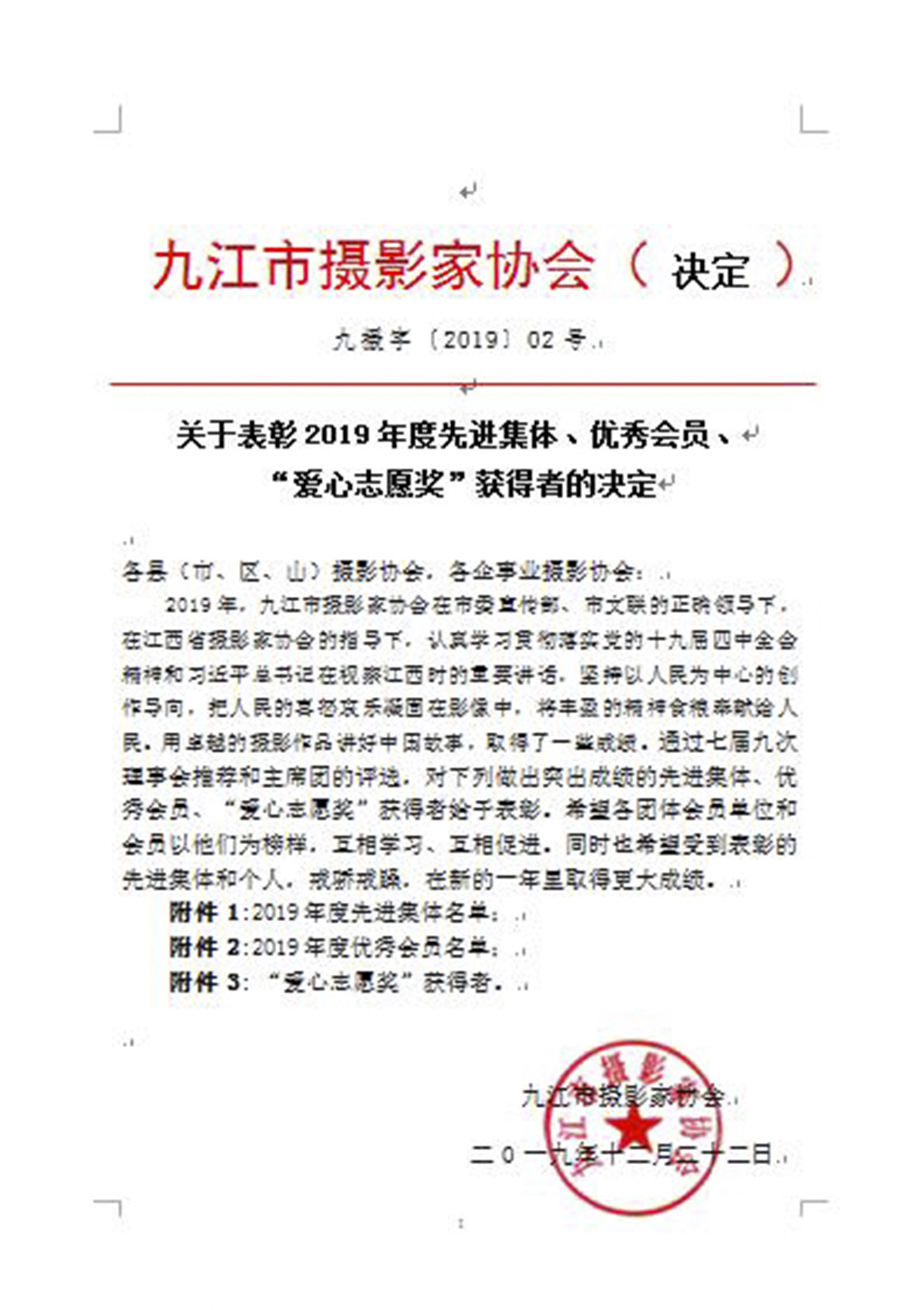 2019年,九江市摄影家协会在市委宣传部、市文联的正确领导下,在江西省摄影家协会的指导下,认真学习贯彻落实党的十九届四中全会精神和习近平总书记在视察江西时的重要讲话,坚持以人民为中心的创作导向,把人民的喜怒哀乐凝固在影像中,将丰盈的精神食粮奉献给人民。用卓越的摄影作品讲好中国故事,取得了一些成绩。通过七届九次理事会推荐和主席团的评选,对下列做出突出成绩的先进集体、优秀会员、“爱心志愿奖”获得者给予表彰。希望各团体会员单位和会员以他们为榜样,互相学习、互相促进。同时也希望受到表彰的先进集体和个人,戒骄戒躁,在新的一年里取得更大成绩。