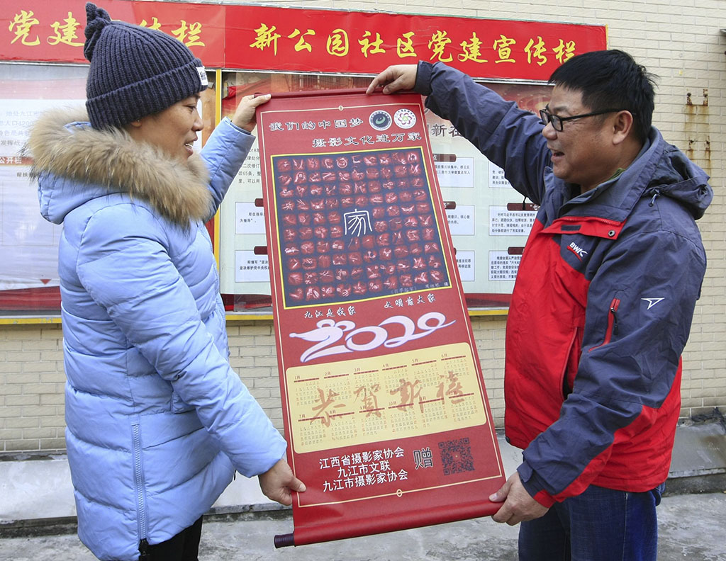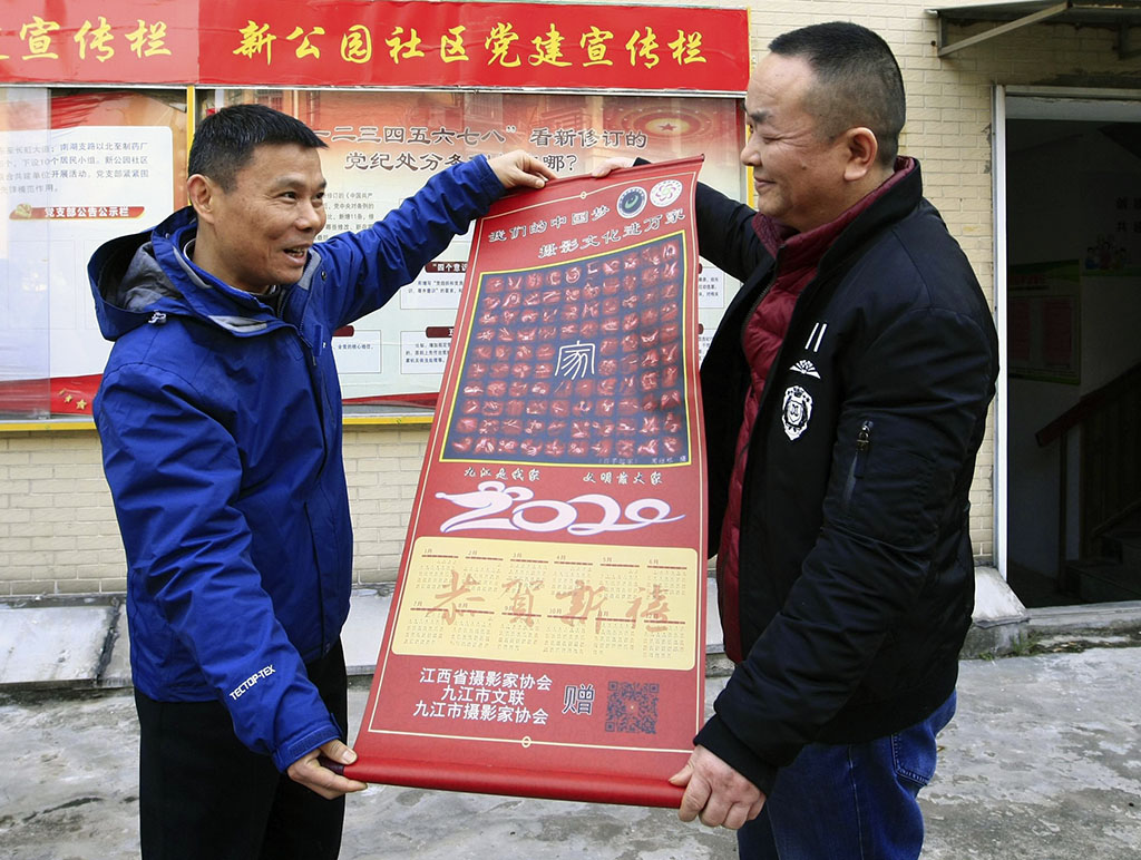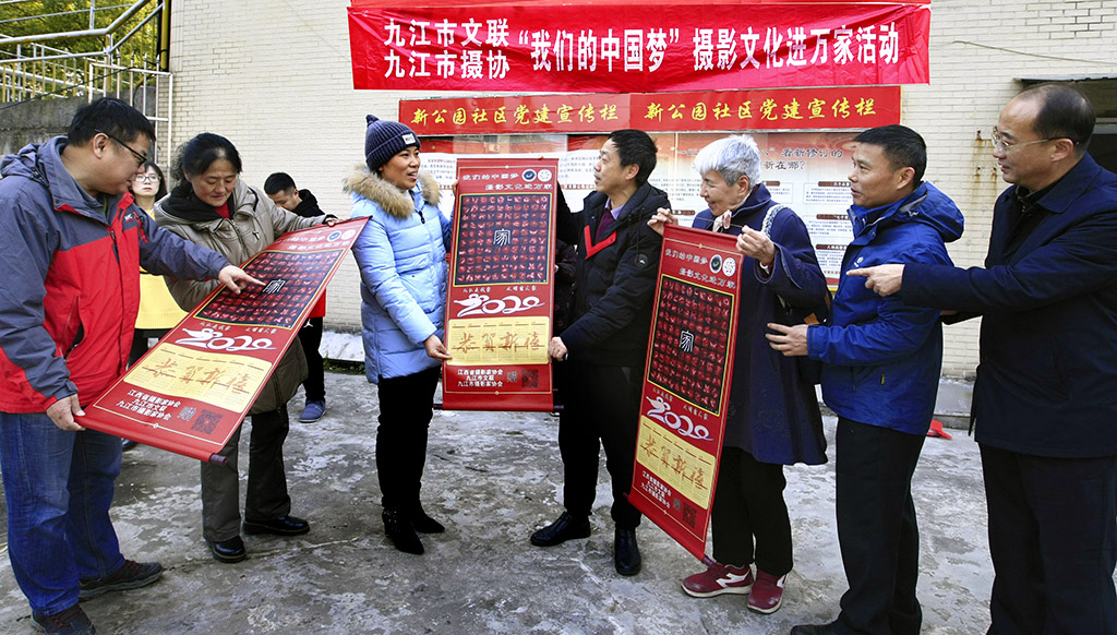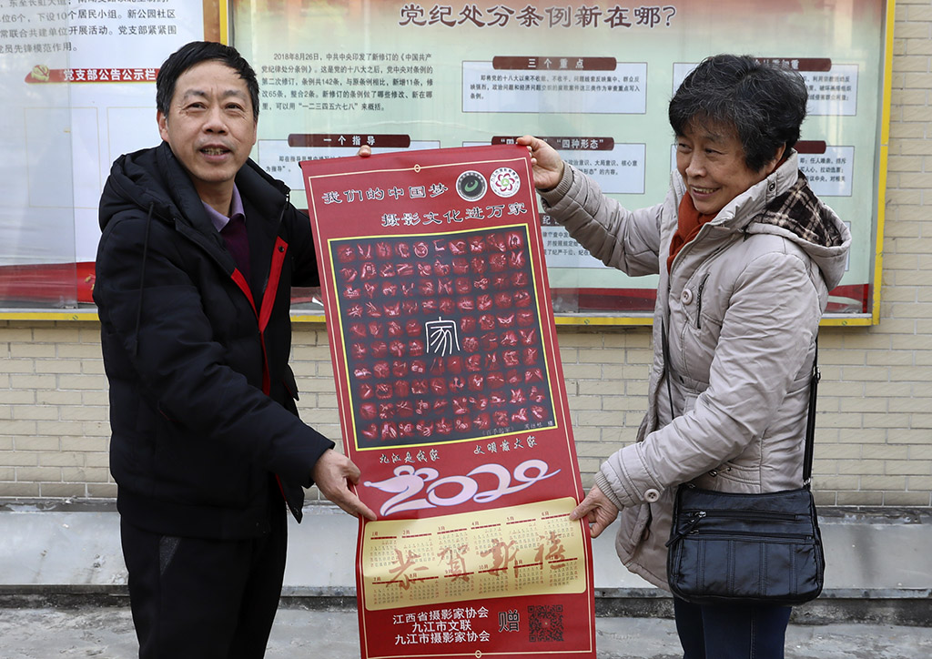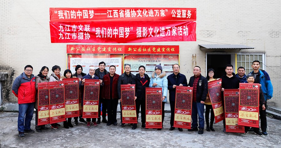 九江摄影网讯(木力)2020年1月20日上午,由江西省摄影家协会副主席、九江市文联副主席、九江市摄影家协会主席宋小勇,九江市摄影家协会副主席蔡杰、杨青,副秘书长李涛渊等摄影人所组成的“红色文艺轻骑兵”走进了浔阳区新公园社区,开展“我们的中国梦——摄影文化进万家”公益活动,向辛勤工作的社区干部、部分居民赠送了用摄影家们自己的作品编印的贺岁挂历,并祝他们新春快乐!