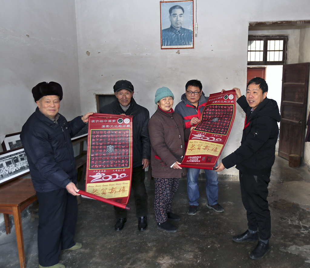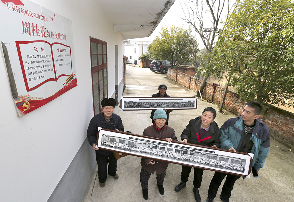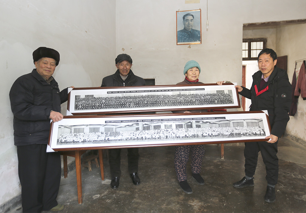 九江摄影网讯(木力)1月19日上午,由江西省摄影家协会副主席、九江市文联副主席、九江市摄影家协会主席宋小勇,九江市摄影家协会副秘书长李涛渊和老艺术家、歌曲《放牛娃歌唱周总理》的词作者徐嘉琪等一行来到庐山市白鹿镇玉京村,为当年周恩来总理在观音桥遇到的放牛娃周桂花,送上修复、放大并装裱好了的当年她参加全国人民代表大会的大型合影照片。