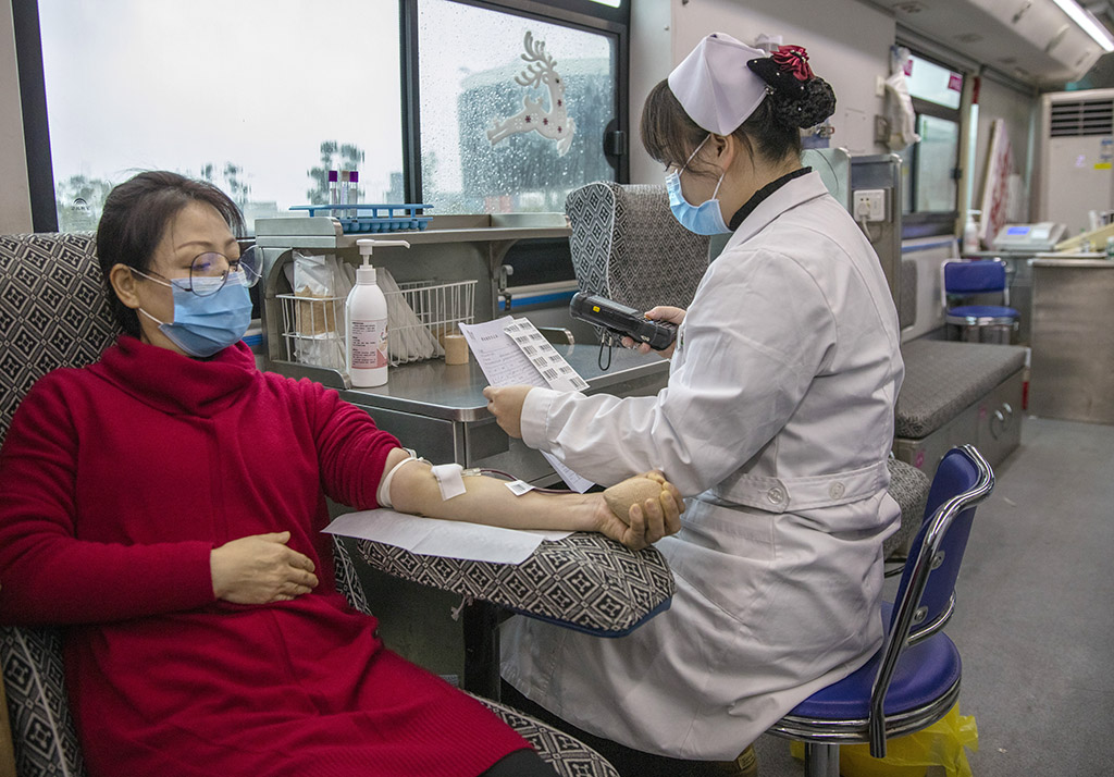 景如松正在献血中 景如松接到九江市中心血站的邀约电话,她没有丝毫的犹豫答应了邀约,由于是在冠状病毒疫情管控期间,交通不太便利,血站主动将献血车开到她居住的小区。这次她献血300毫升,至此她的总献血也达到了两千多毫升。