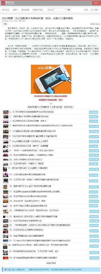 九江摄影网讯(木力)日月开新元,天地又一春。过去的2019年,是中华人民共和国成立70周年,也是摄影术发明180周年。回首2019年,会员作品先后在第27届全国摄影艺术展览、第九届全国农民摄影大展、香港第九届全国摄影艺术展览、第三届深圳国际摄影大展、“我和我的祖国”——摄影、短视频全国优秀作品展等全国性比赛、展览中入选和获奖;回首2019年,我们摄影展览、比赛活动好戏连台。九江市摄协围绕新中国成立70周年和九江市委、市政府的中心工作,展示九江建设的伟大成就,举办了一系列的展览、比赛活动。特别是“我和我的祖国”——庆祝中华人民共和国成立70周年大型摄影展览规模宏大,内容丰富,得到了九江市四套班子领导和人民群众的赞誉……为更好地总结和回顾2019年九江市摄影事业的发展历程,让更多的人了解摄影、关注摄影、支持摄影,九江市摄影家协会、九江新媒体“掌中九江”联合开展了2019年“九江市摄影界十大新闻”评选活动。活动至2月10日结束,历经半个月时间,参与点击、投票达到20109人次,经过广大网民们的投票,根据投票结果,从九江摄影网初选的30件大事件中,评选出了2019年“九江市摄影界十大新闻”和2019年“九江市摄影界十大新闻提名”,现将评选结果进行公布。