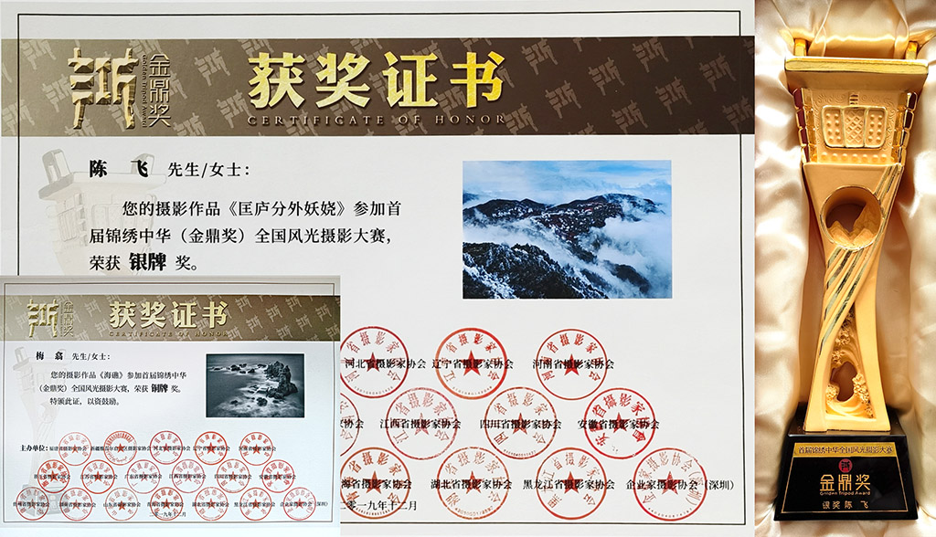 被摄影界誉为“风光国展”的首届锦绣中华(金鼎奖)全国风光摄影大赛,由福建、广东、浙江、江苏、河南、河北、新疆、辽宁等全国17个省(自治区)摄协及企业家摄协(深圳)共同主办。大赛自2019年9月1日启动,12月29日完成终评评选工作,共收到全国31个省市自治区及港澳台地区、新加坡等地8290余位作者的95436幅作品,经过组委会历时半个月的初评和终评工作,200幅获奖佳作脱颖而出。庐山摄影家陈飞的作品《匡庐分外妖娆》获得银奖,湖口摄影家梅翕的作品《海礁》获得铜奖,为九江、为江西争得了荣誉。
