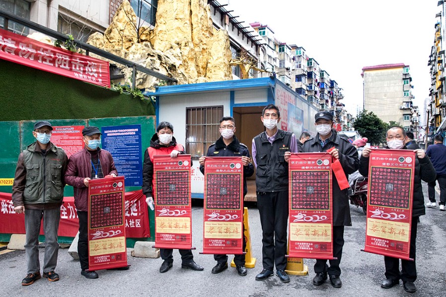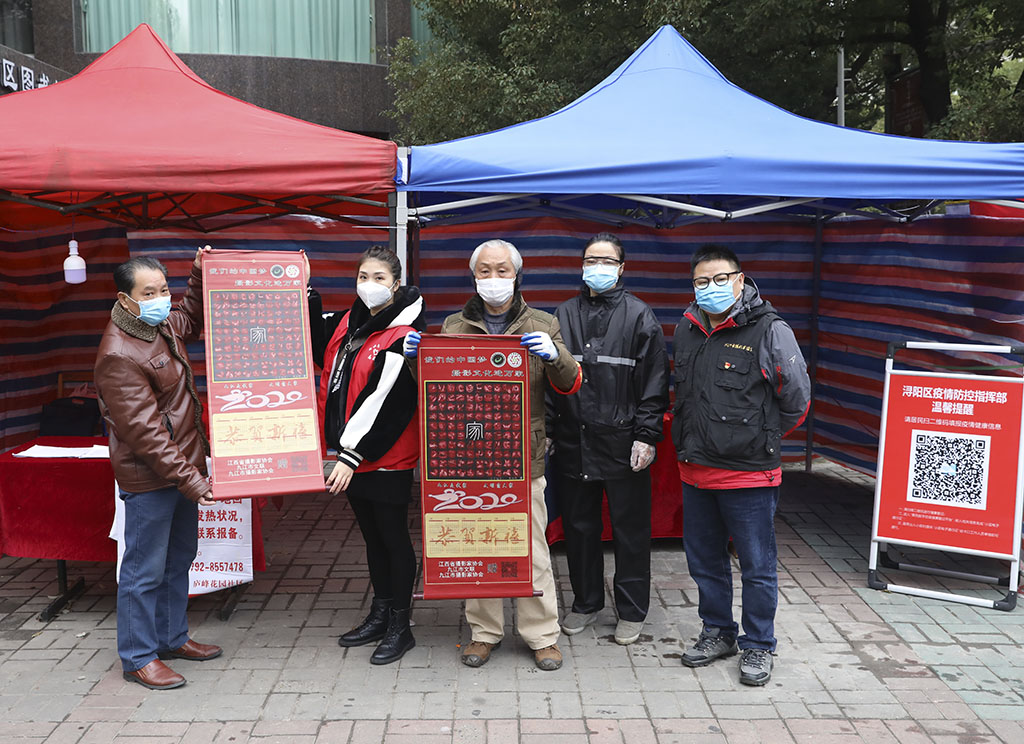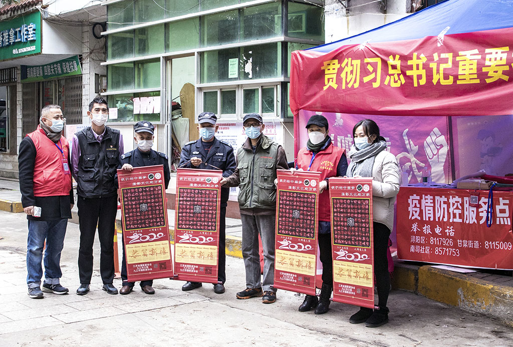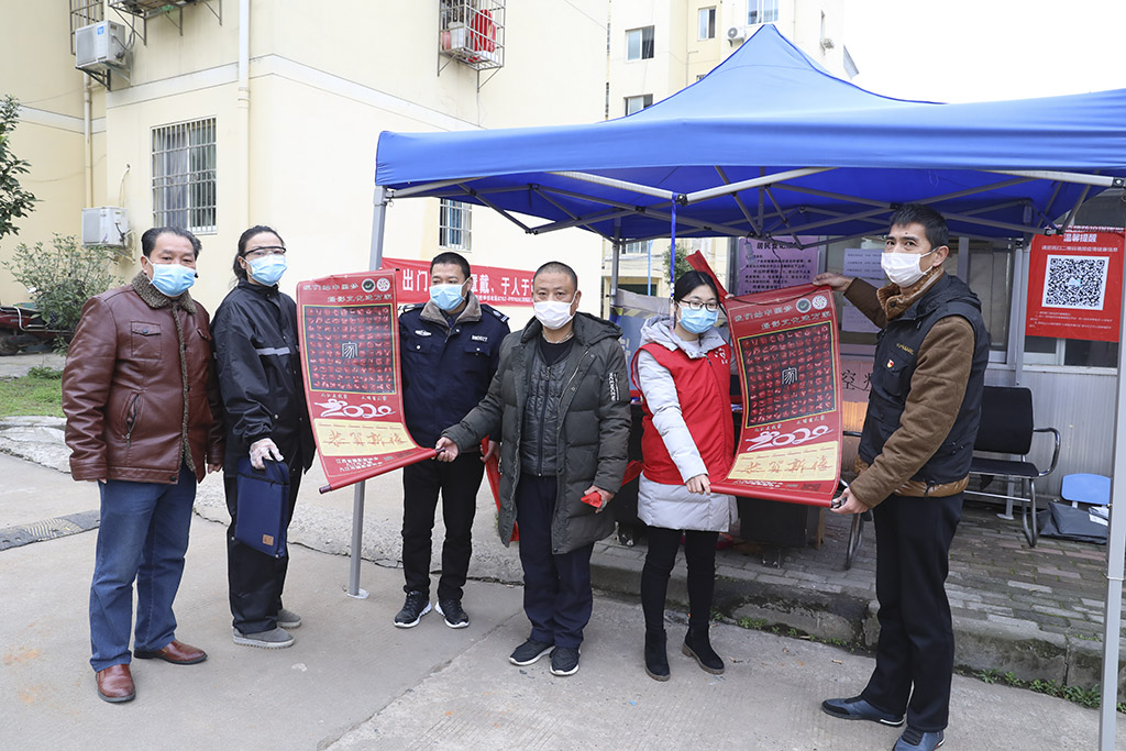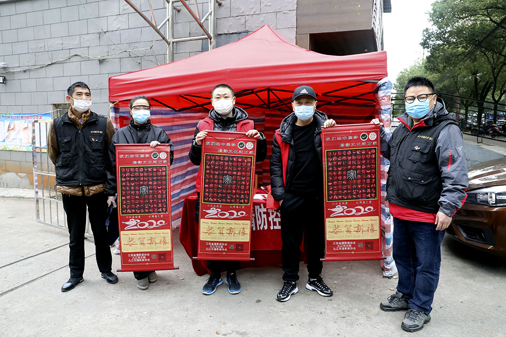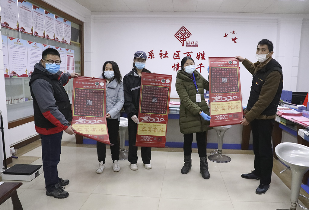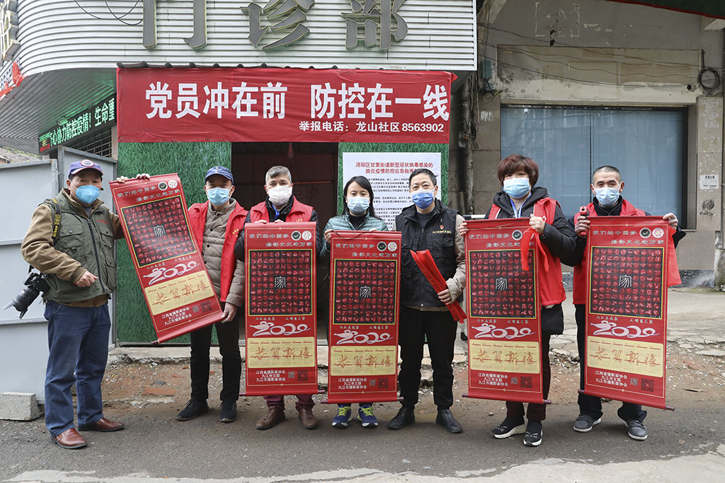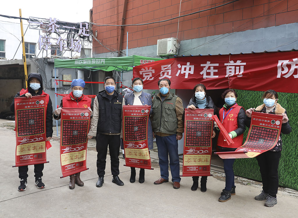 九江市摄影家协会副秘书长李涛渊,协会事理、办公室负责人刘盛,协会会员、摄影志愿者黄俊、张晓鸣、徐敏芳等一同走访慰问,并向社区志愿者们赠送了摄影作品《百手起家》卷轴。