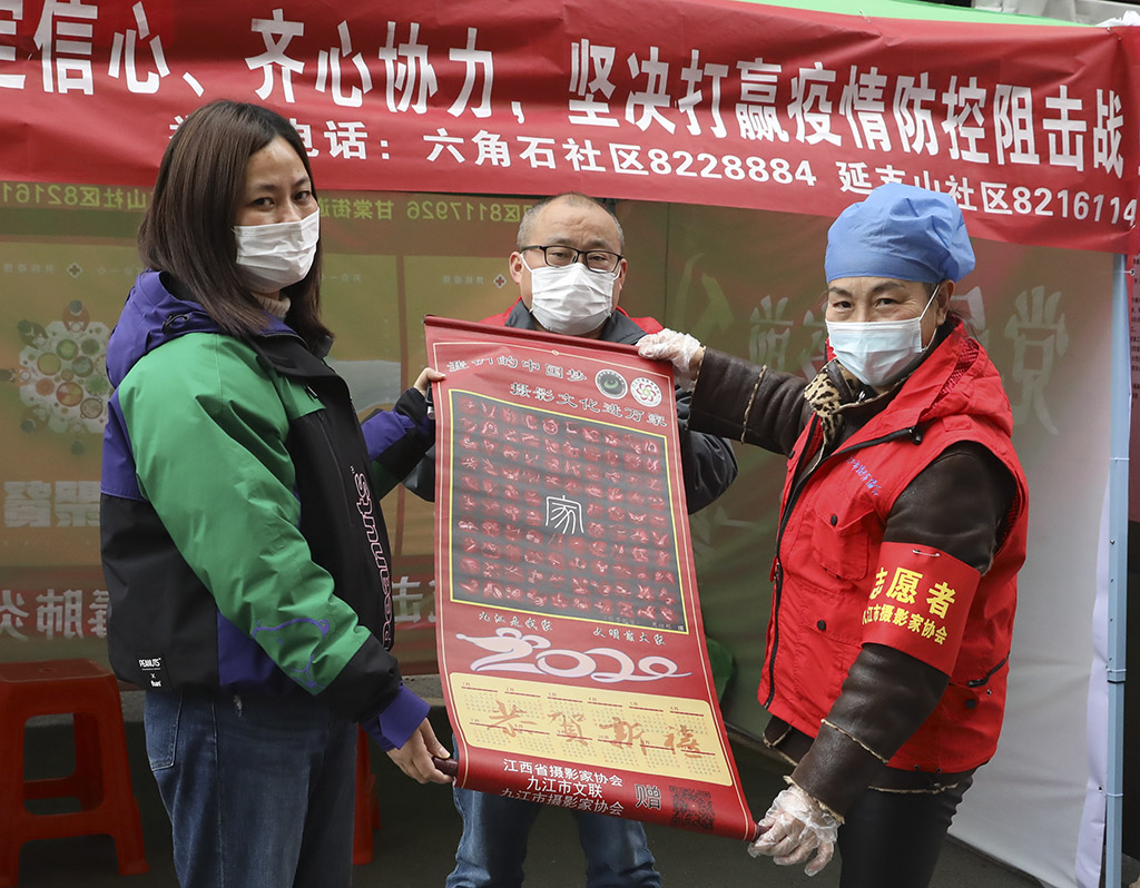 李涛渊向湓浦社区防疫关口志愿者赠送摄影作品转轴