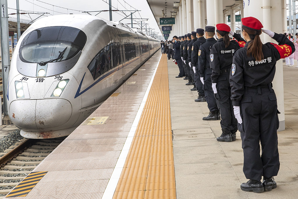 特警向搭载抗疫英雄的高铁致敬 刘 盛 摄