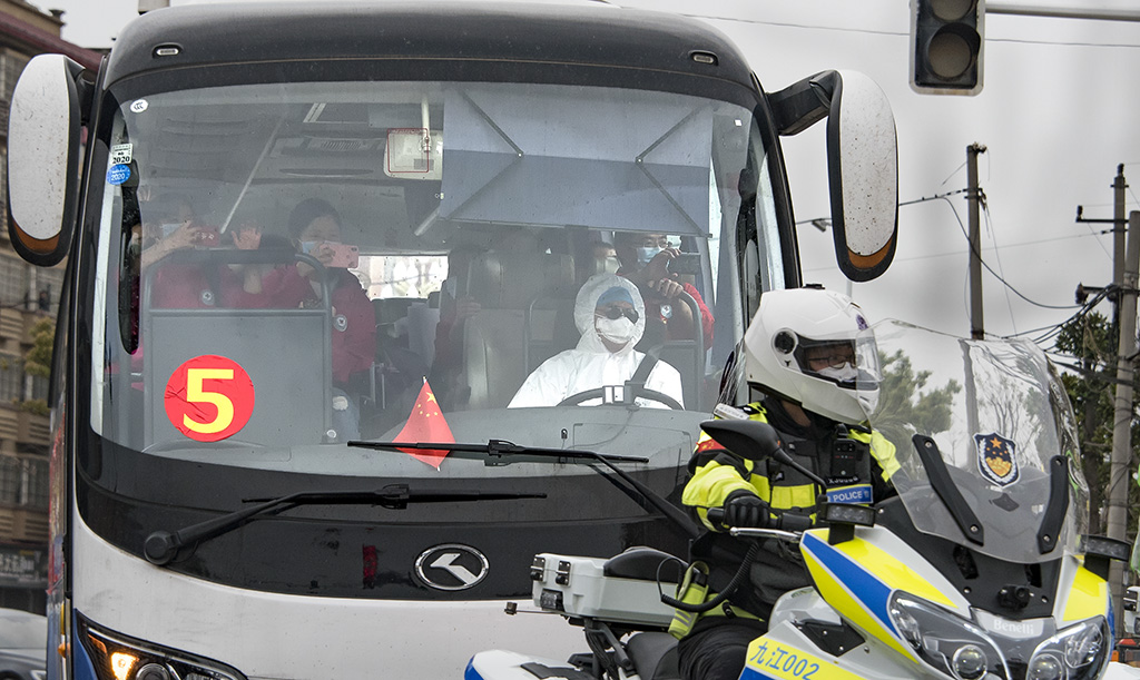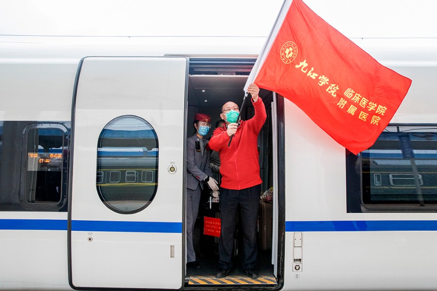 援鄂重症医疗队队长、九江学院附属医院院长殷小平走出车厢 刘 盛 摄