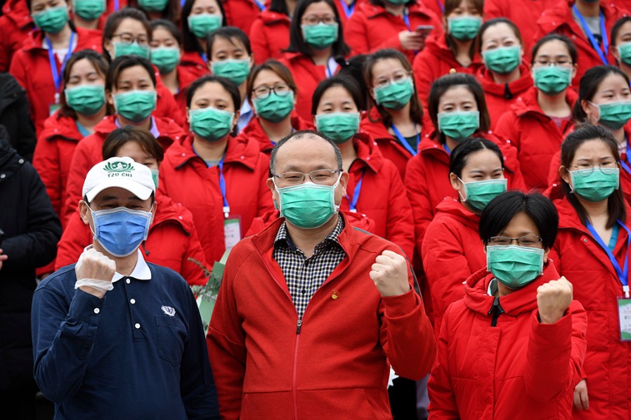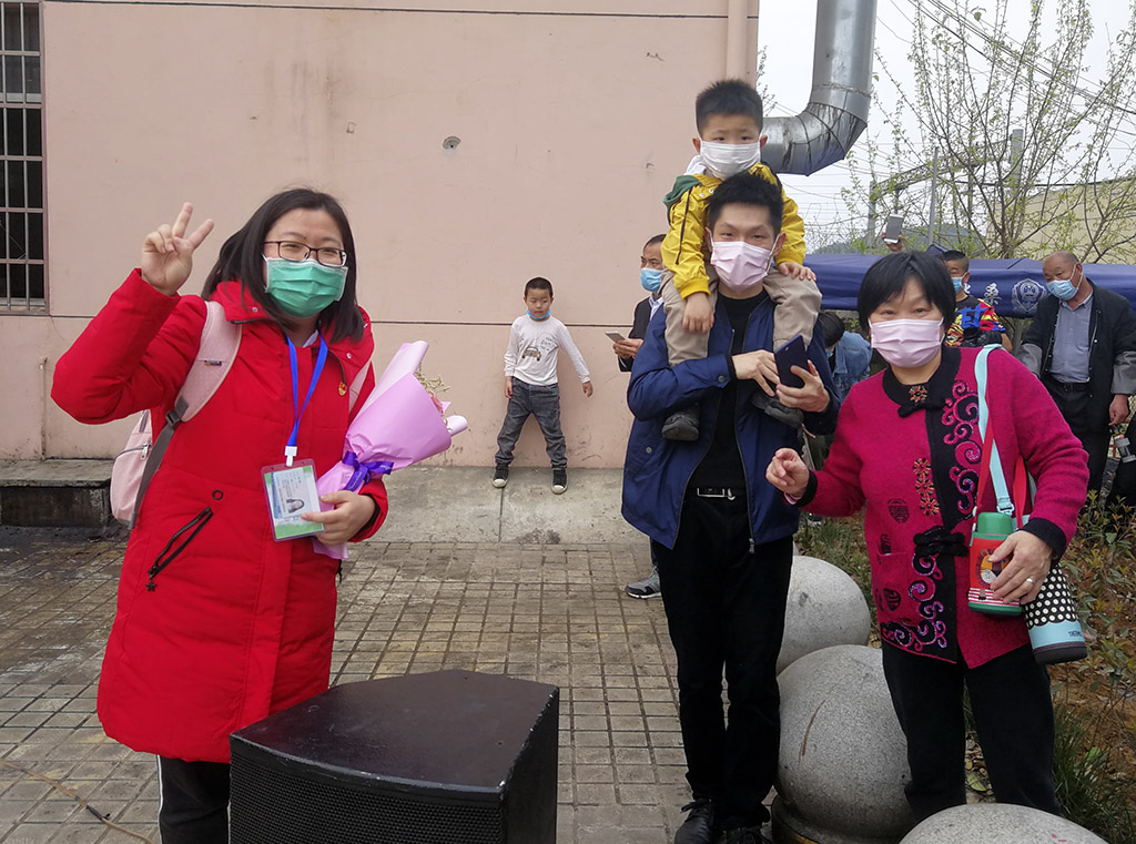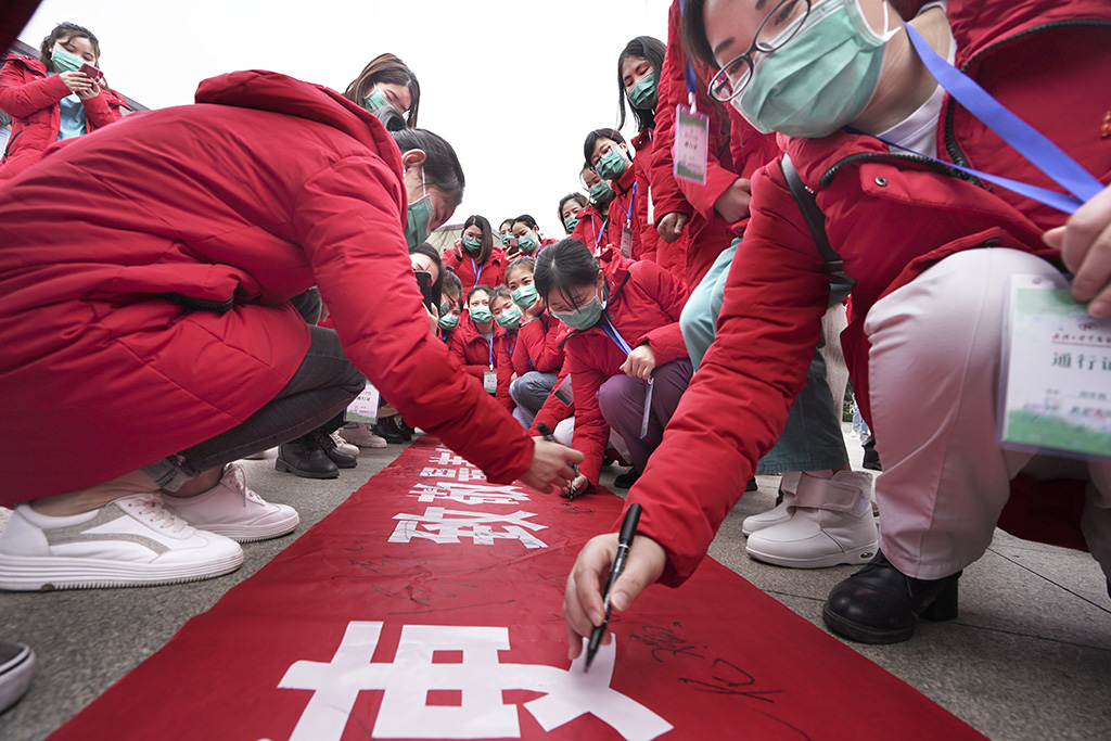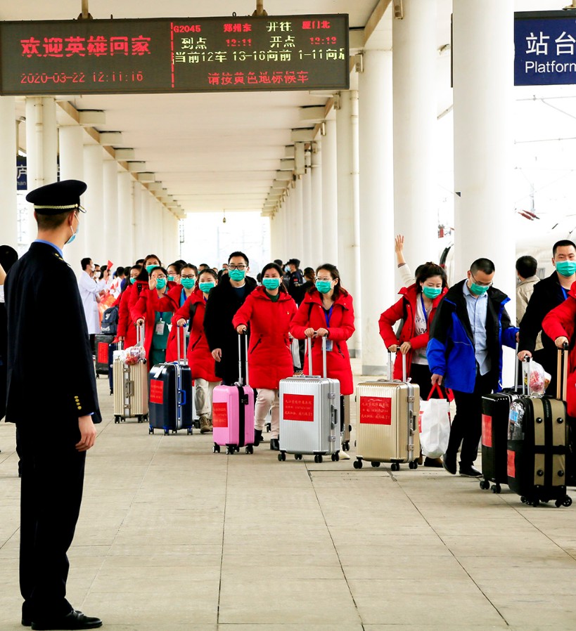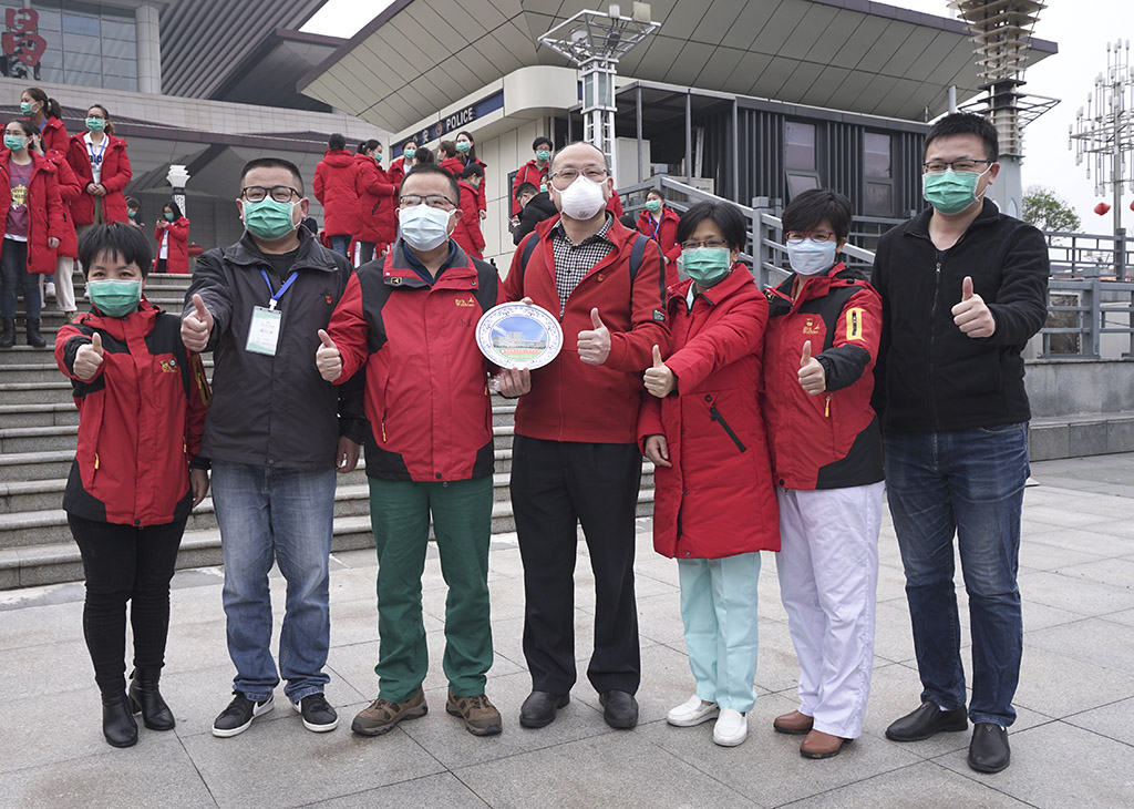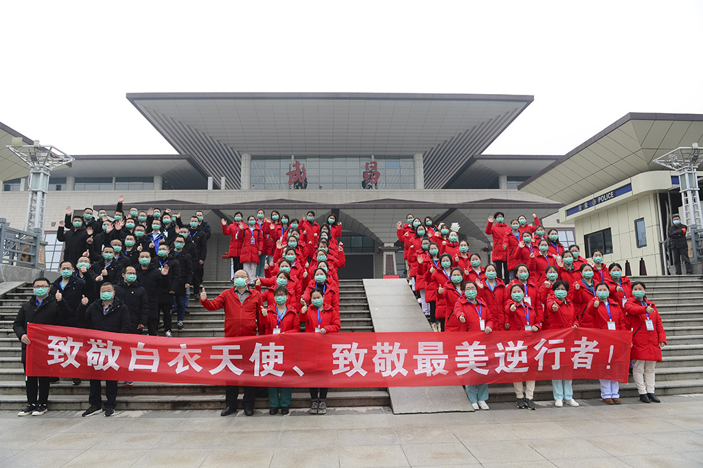 最美逆行者—临别前医疗队武昌站合影 田 悦 摄