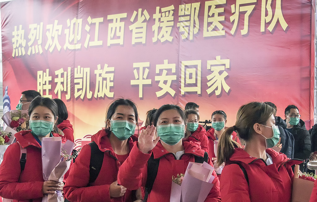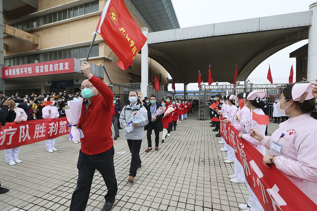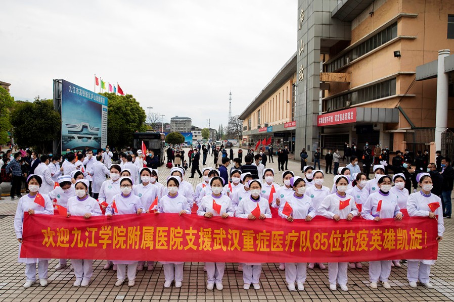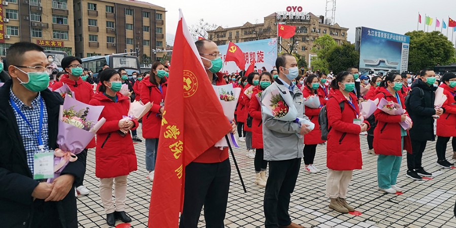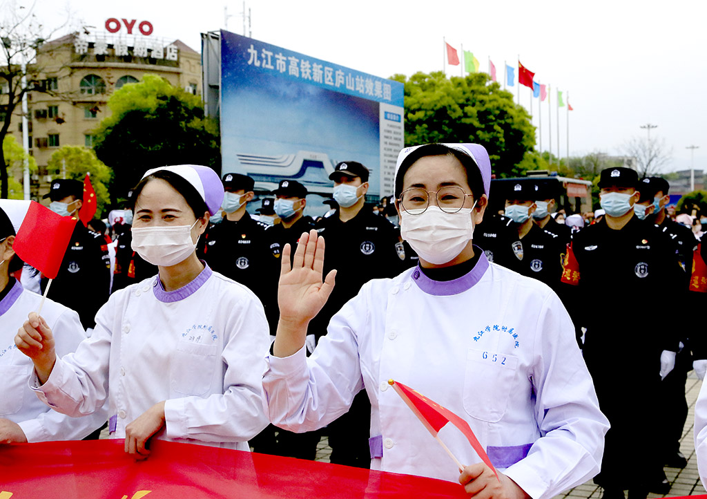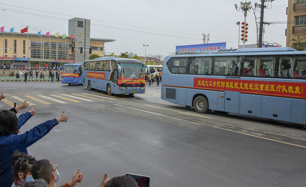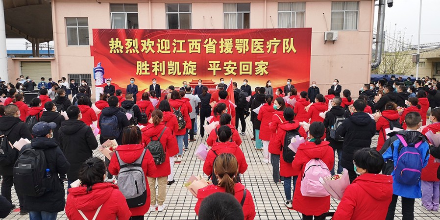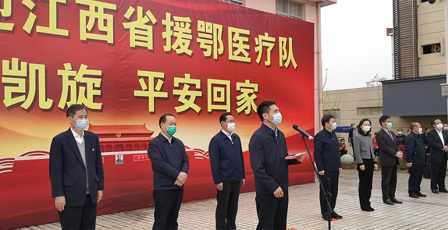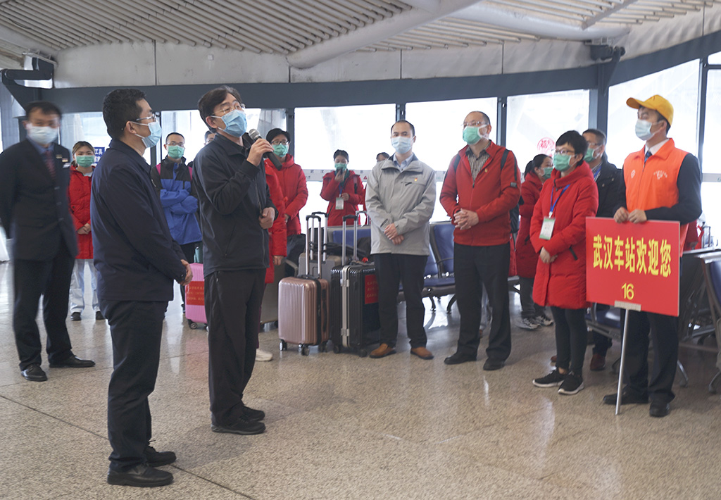 为江西(九江)援鄂重症医疗队送行 田 悦 摄 在武汉高铁站,武汉市副市长刘子清等领导参加了欢送仪式,他们向医疗队表达了感谢。刘子清说,南昌和武汉都是英雄城,江西老表都有着英雄气概,你们逆行而上和武汉的医务工作者一起战斗,把我们很多父老乡亲从死亡线上拉了回来,是你们给了他们第二次生命,向你们表示深深的敬意。