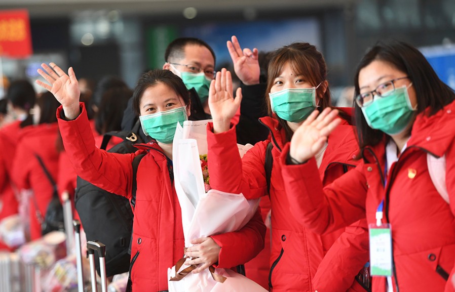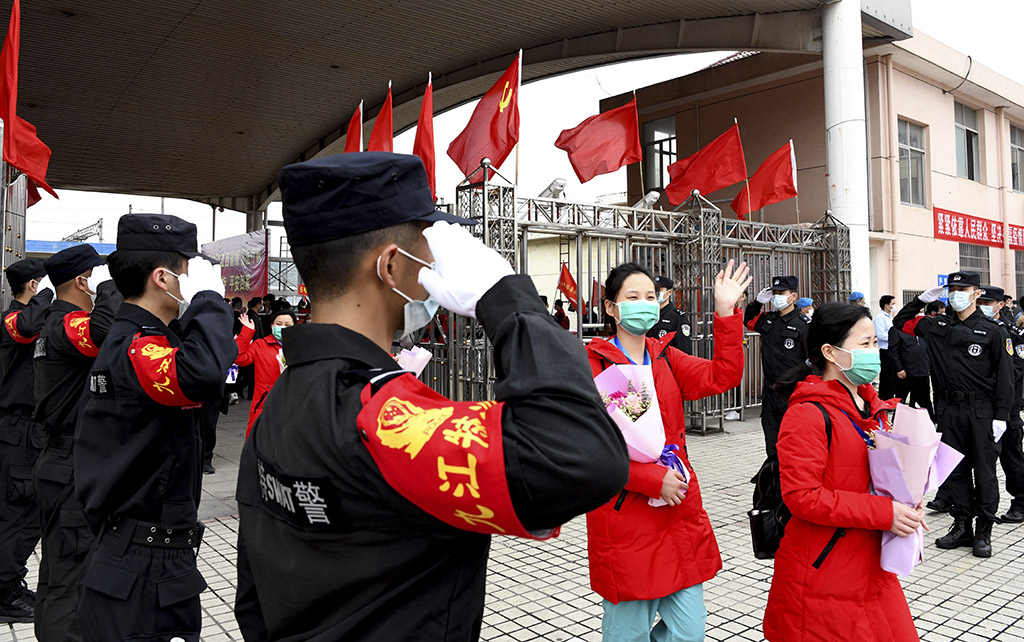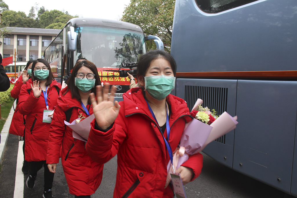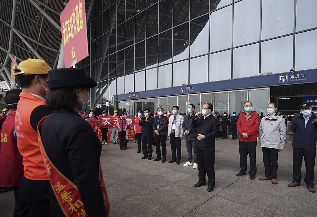援鄂医疗队员在队长殷小平率领下走出站台 杨 青 摄