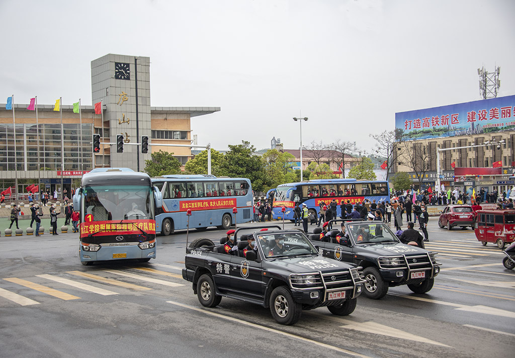 “大家辛苦了,欢迎回家!”受林彬杨委托,谢来发在欢迎仪式上讲话,为勇士们的英雄壮举点赞。 在林彬杨、谢来发的目送下,队员们列队走上等候已久的大巴车,转赴庐山汤太宗温泉酒店集中休养休整。车队前,警用摩托组成箭阵为英雄护航,车队徐徐驶出。此刻,春和景明,春风和煦,笑容挂在队员们的脸上。 省卫健委副主任龚建平、省退役军人事务厅副厅长雷起平,副市长李军、市政府秘书长鲍成庚,九江学院校领导赵伟、刘晓东、杨耀防以及九江市卫健委主任周泽甫、九江市退役军人事务局局长谢恒春,柴桑区委书记骆效农,区委副书记、区长赵和平等一同迎接。