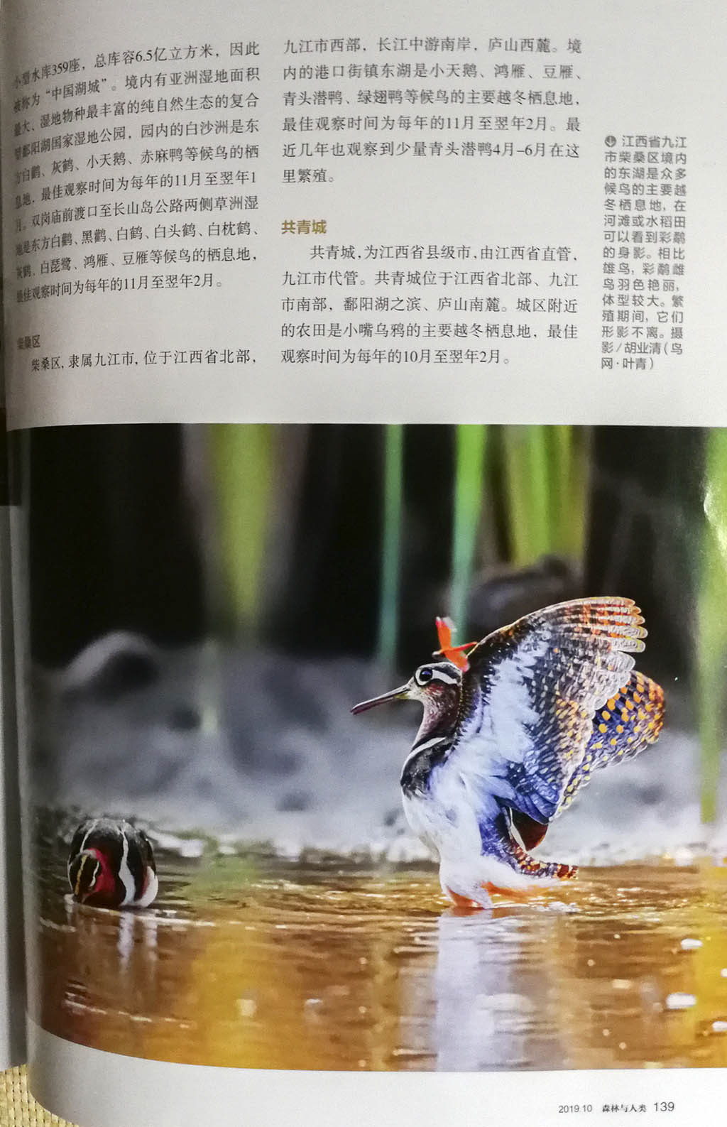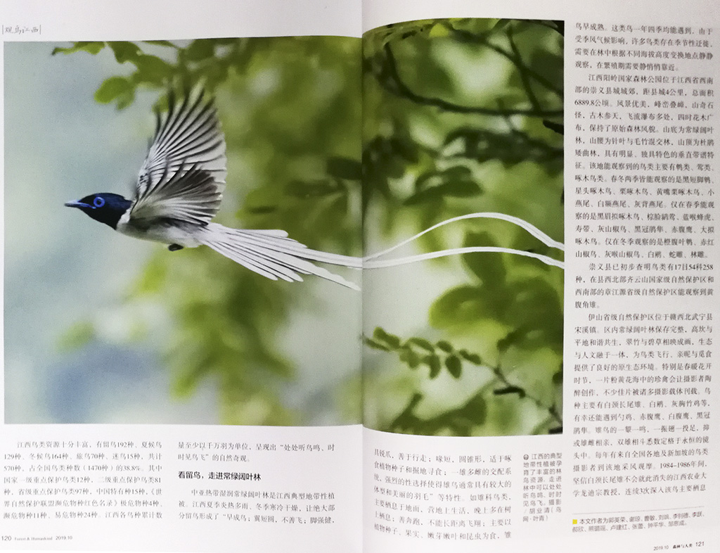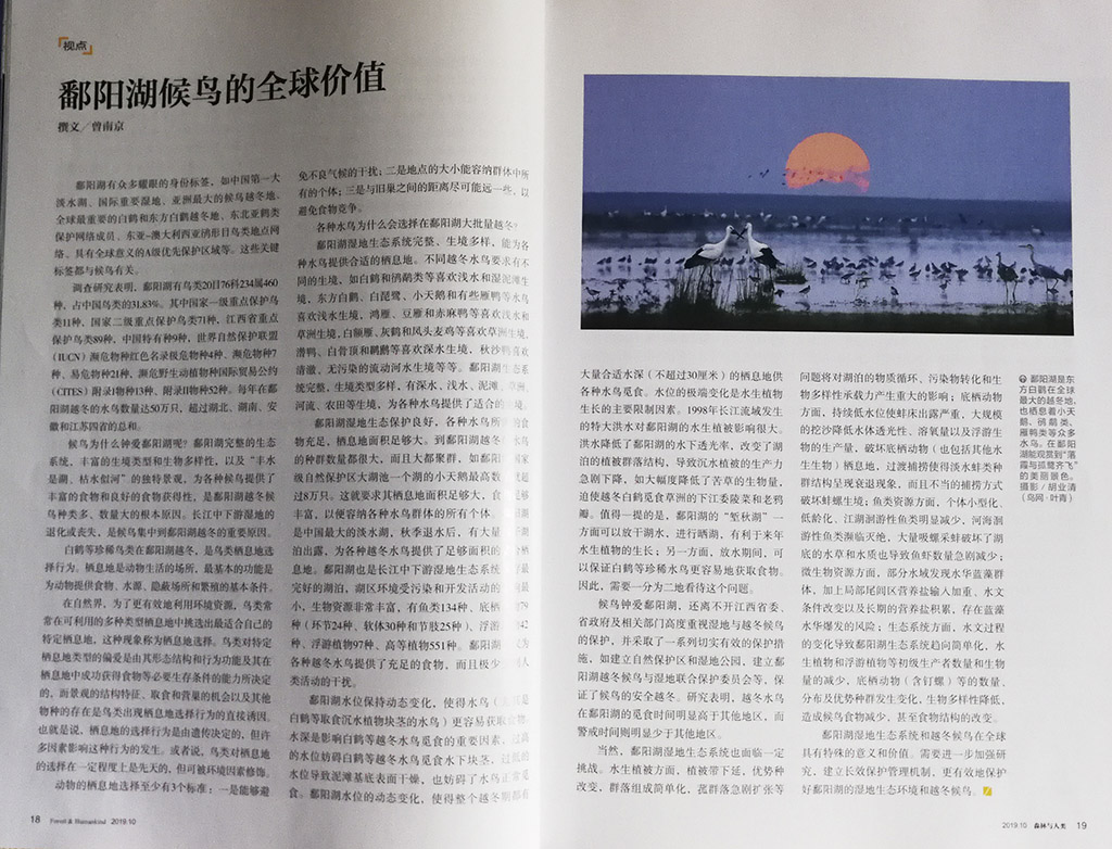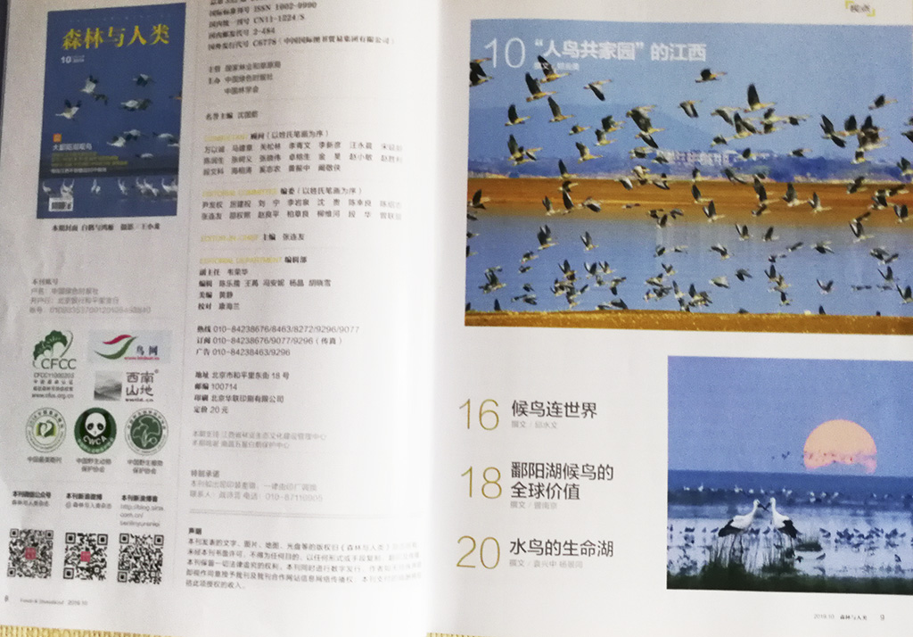 九江摄影网(木力)由国家林业局主管,中国绿色时报社和中国林学会主办的《森林与人类》总第352期2019/10“大鄱阳湖观鸟” 特刊中,刊登了中国摄影家会员、九江摄影家胡业清的六幅生态摄影作品。