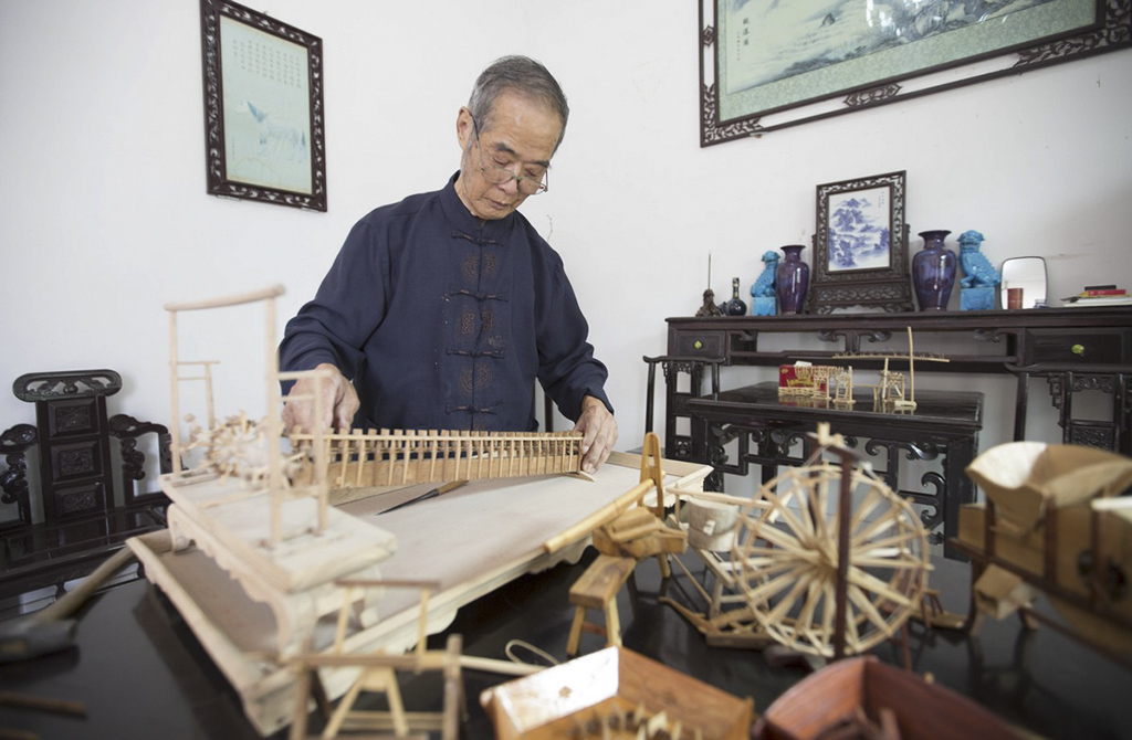 俞圣记:从事木工59年,2010年,他开始尝试用红梨木和樟木手工制作微缩版农耕器具。10年来,已成功制作出了上百套各式农具模型。