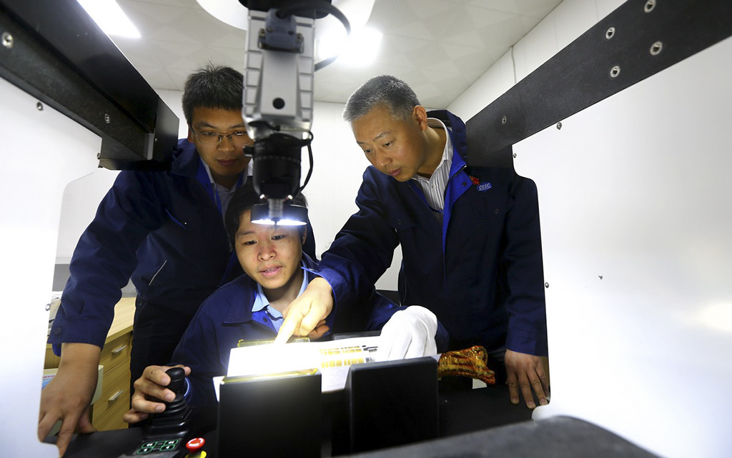 《赣鄱英才》(优秀奖) 欧阳海员 摄 邓 军:九江精达检测技术有限公司总经理(右一),第三批”赣鄱英才555“工程人选。图为他在和年轻的科技人员一起探讨技术难题。