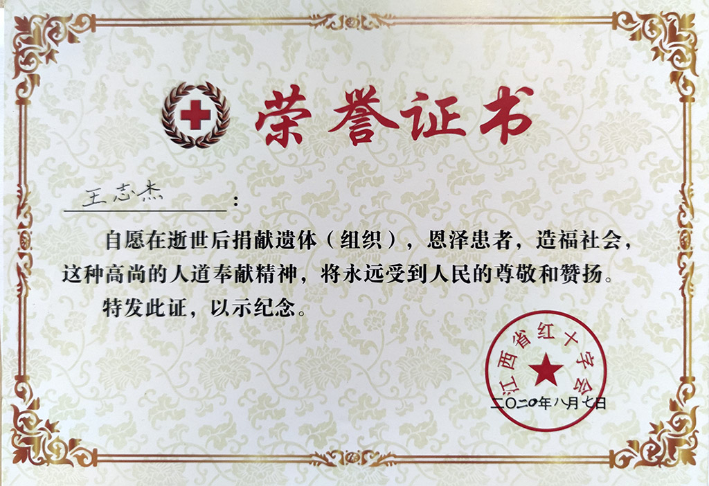 遗体将捐献荣誉证书