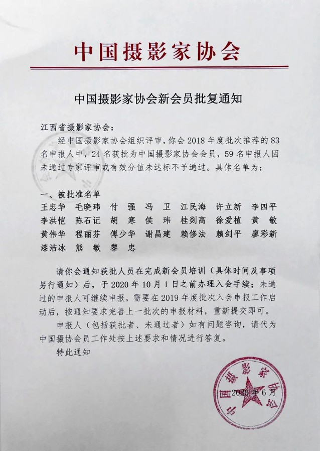 九江摄影网讯(宋小勇)在中国摄协2018年度批次新会员审核当中,江西省推荐的83名会员,最终有24人喜获批准,成为中国摄协新会员,通过率超过全国平均水平。其中九江有5人,他们是:冯卫、江民海、陈石记、桂剡高、黎忠,在全省属于领先水平。现将《中国摄影家协会新会员批复通知》转发如下: