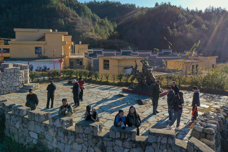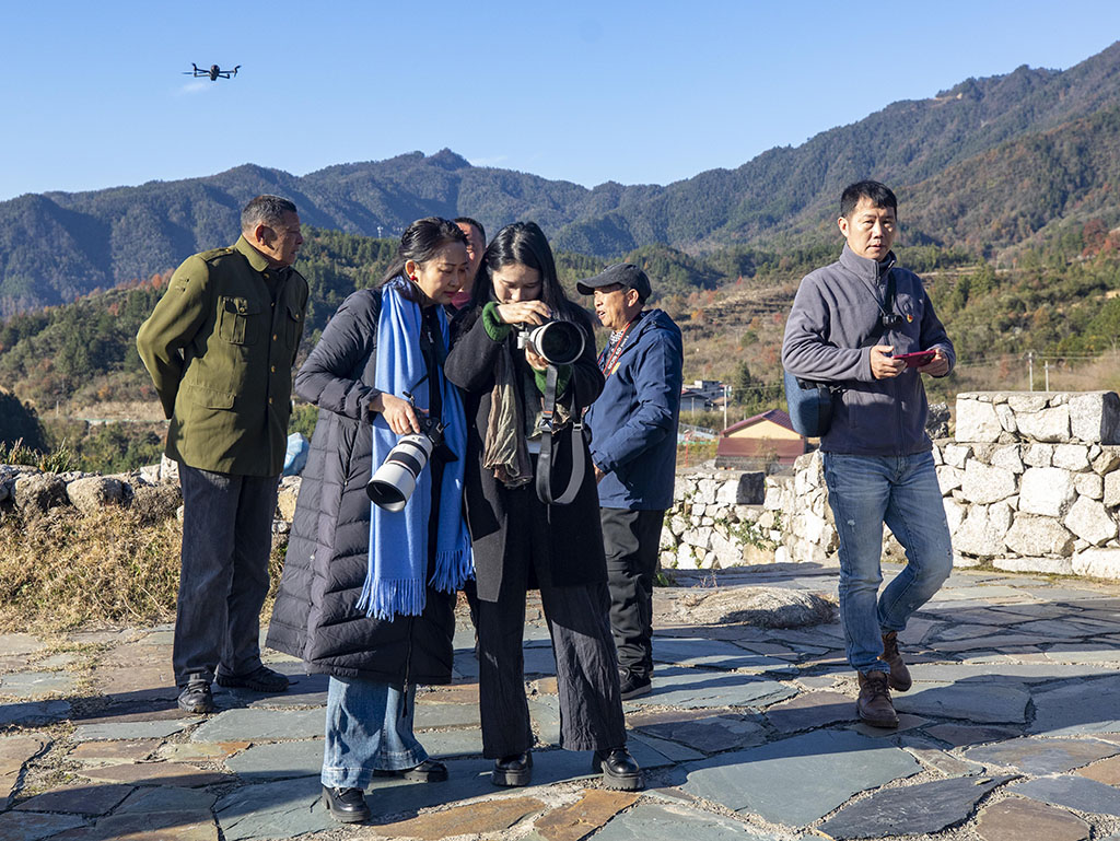 当天上午,采风团首先来到九宫村。在巍然矗立的红军岗哨台塑像前,大家利用相机、无人机等设备,将朝阳下的红军塑像定格为永恒的历史记忆。走上红军桥,古朴的桥墩诉说着岁月的故事;潺潺流水声中,仿佛能听见往昔军民同心的回响。随后,大家走进苏维埃政府旧址,这里保存着承载历史记忆的浮雕、壁画以及简朴的旧物,每一处细节都成为摄影爱好者探寻红色记忆的生动素材。