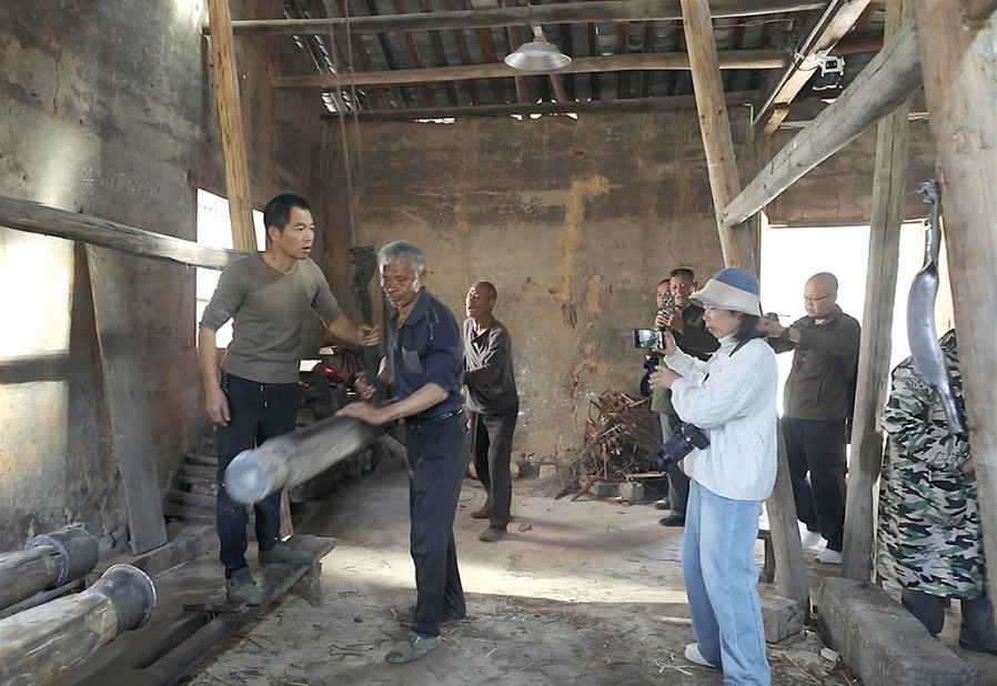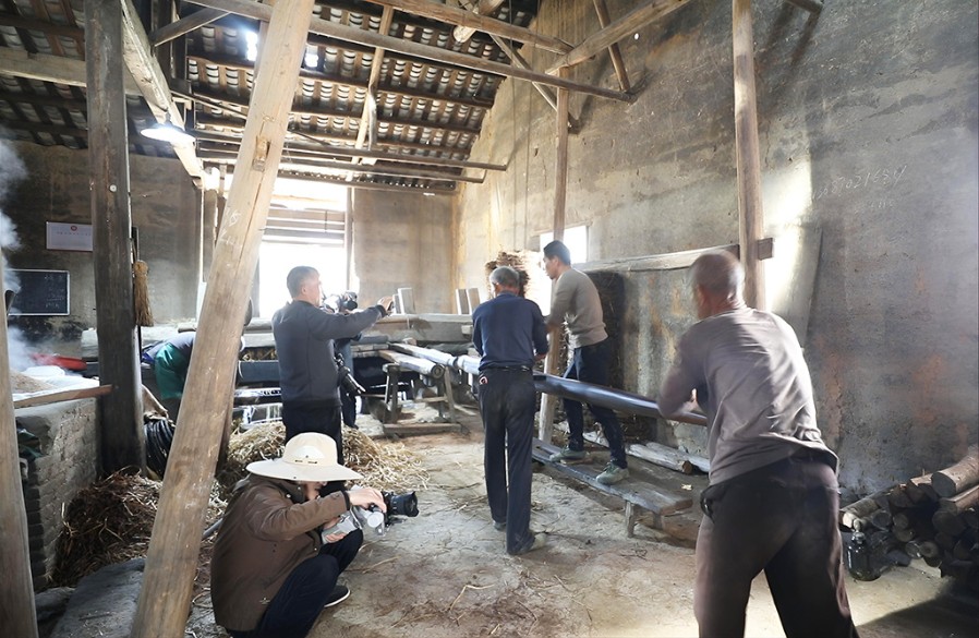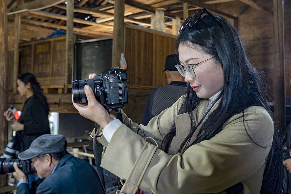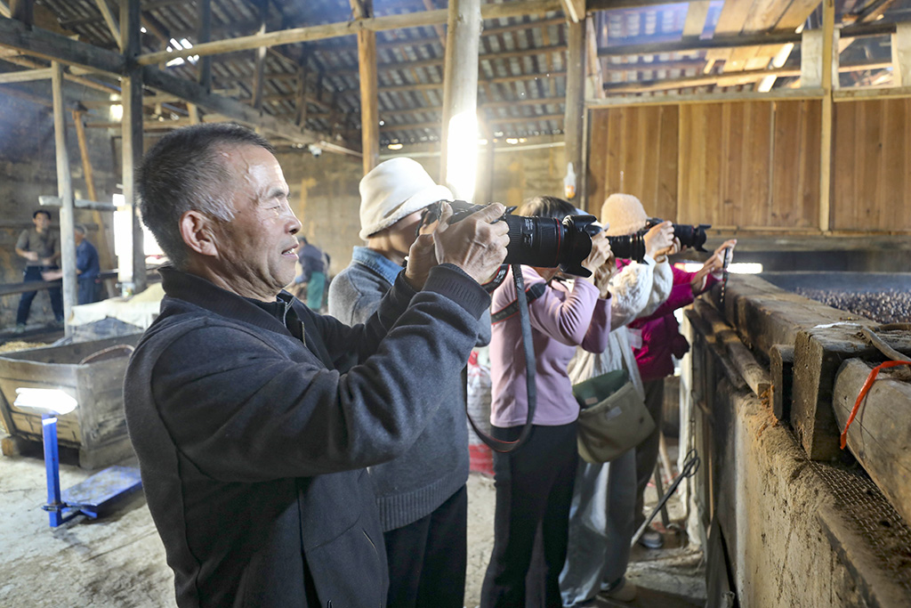 午后,众人转到一座传承百年的手工榨油作坊。一进门,醇厚的油香便扑面而来。作坊里,古老的木榨器具泛着温润的光泽,水动碾盘不停运转。烤籽、蒸粉、包饼、排榨、槌撞,每一道工序都成了拍摄的素材。师傅喊着铿锵的号子,挥动沉重而修长的撞针,每一次撞击都发出深沉的响声,金黄的油随之缓缓流出。飞溅的油星在光线下如碎金闪烁,摄影爱好者们凝神屏息,用镜头细致记录师傅们手臂的力度、额角的汗珠以及专注的神情,将这项古老非遗技艺的活力与温度,永远留存于影像之中。