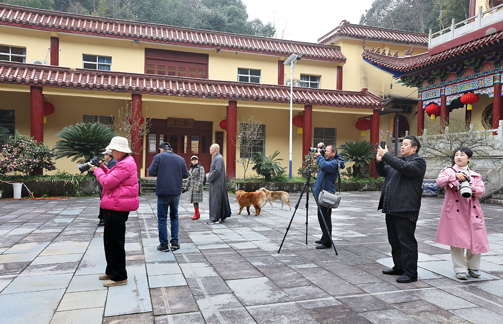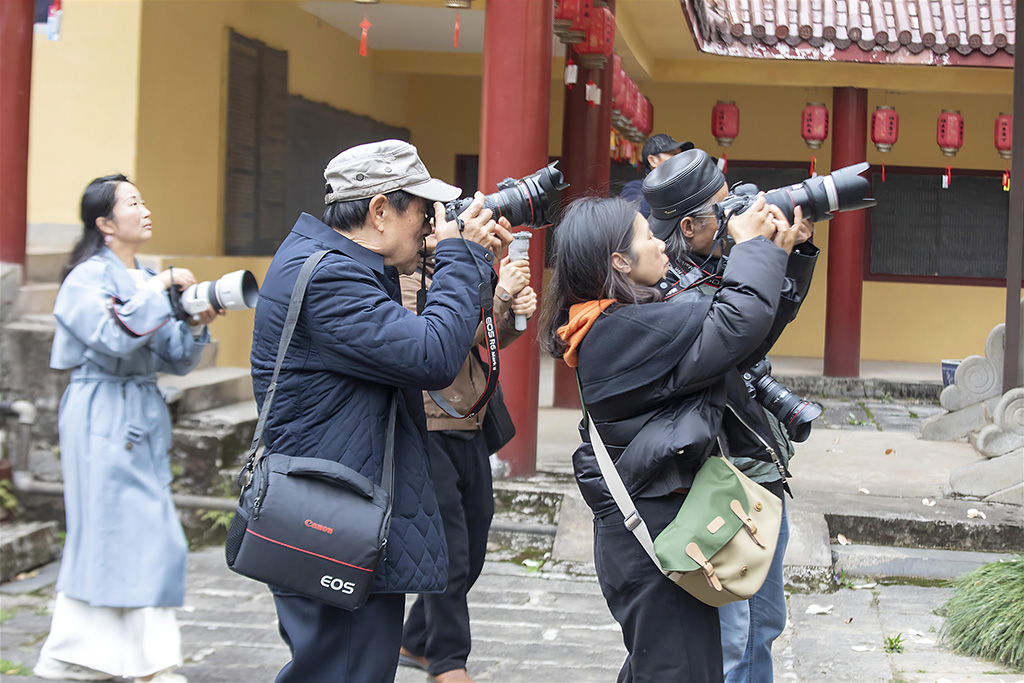 弥陀寺合影 15日上午,采风活动继续。采风团一行首先探访了深藏于杨洲山林之间的千年古刹——弥陀寺。古寺红墙黛瓦,在参天古木的掩映下愈发显得庄严肃穆。晨钟暮鼓,梵音袅袅,自有一派超然气象。院内玉兰芬芳、茶花争艳、牡丹含苞,暗香浮动。会员们在这份难得的宁静中,用心感受,用镜头细腻地捕捉着佛教文化与自然山水和谐共生的禅意之美。